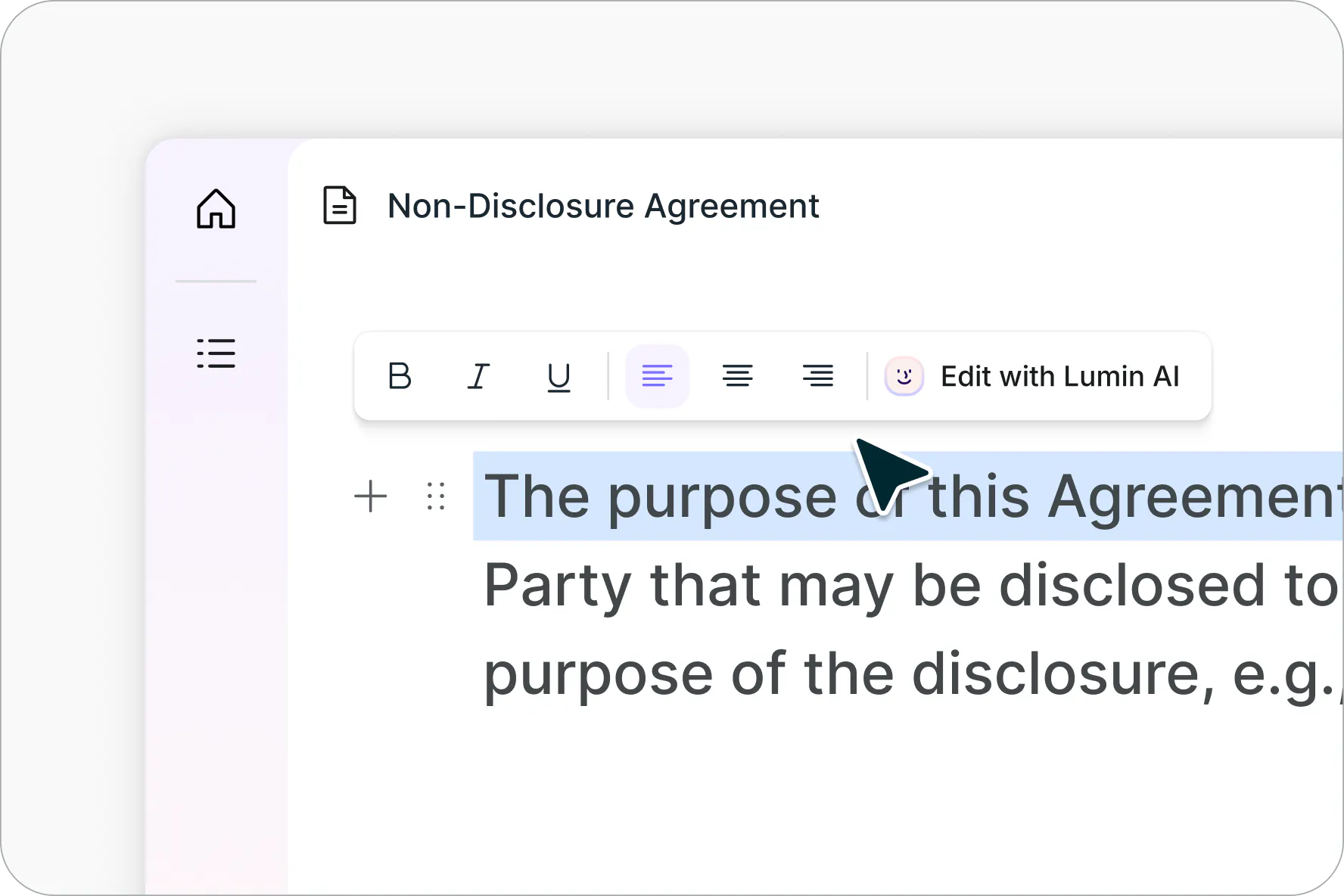 En lugar de redactar manualmente desde cero o copiar un documento antiguo, un generador de acuerdos utiliza IA para ayudarle a crear y personalizar contratos y acuerdos adaptados a sus necesidades.