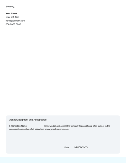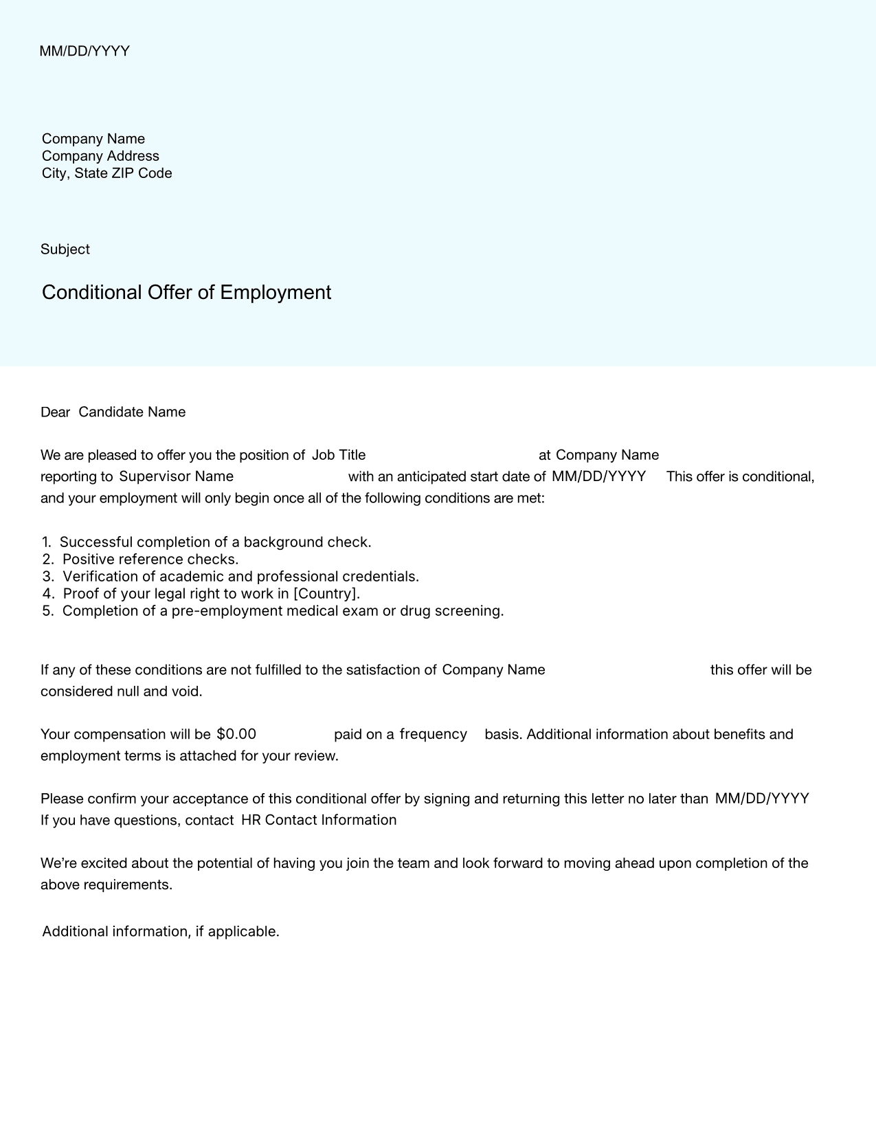 The Conditional Offer of Employment is a formal letter sent to a job candidate outlining an offer that depends on completing specific pre-employment requirements. It includes background checks, proof of work eligibility and credential verification.