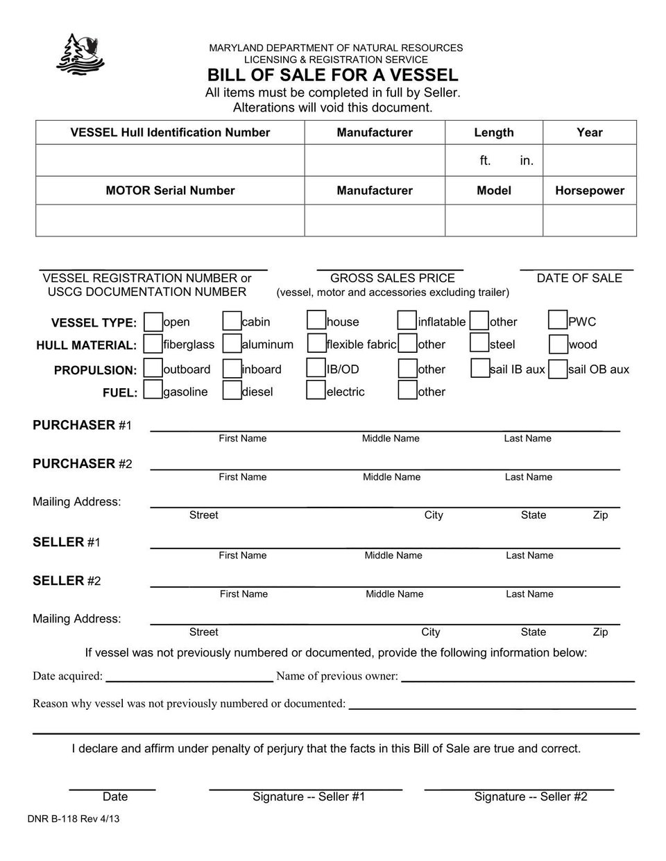 The Form DNR B-118 (2013) is used by sellers and purchasers of a vessel in Maryland. This form is issued by the Maryland Department of Natural Resources Licensing and Registration Service.
