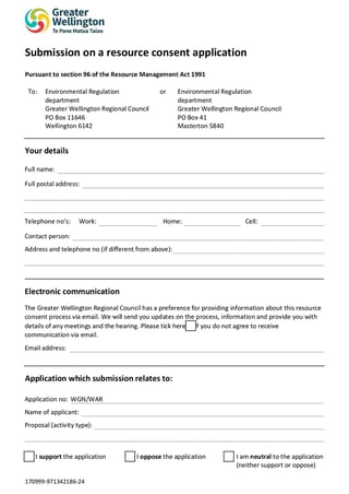The Submission on a Resource Consent Application is used to submit applications for various purposes.