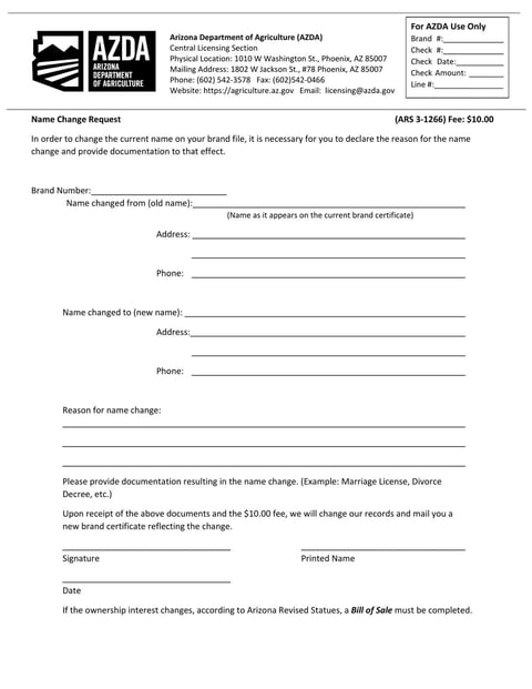 The Form ARS 3‐1266 is a request form for changing the name on a brand file with the Arizona Department of Agriculture.