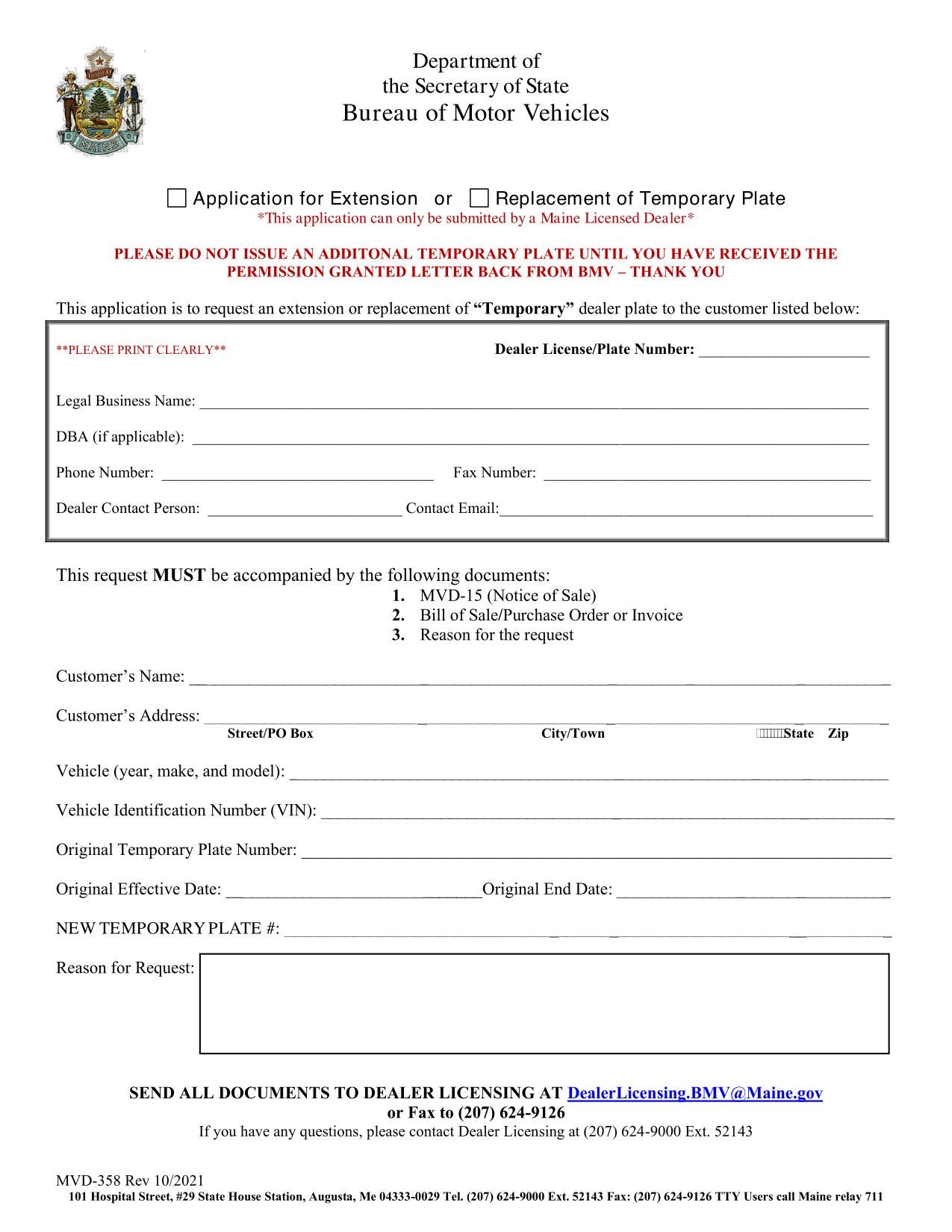 The Form MVD-358 (2021) is used for requesting an extension or replacement of a temporary dealer plate in Maine.
