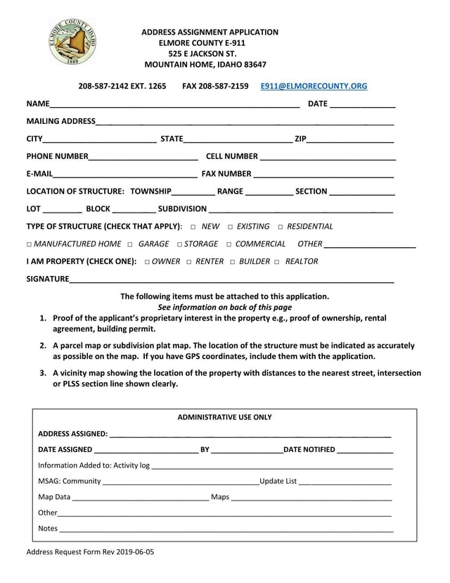 The Elmore Address Assignment Application is a form used by residents, property owners, renters, builders and realtors in Elmore County to request accurate addresses for emergency services.