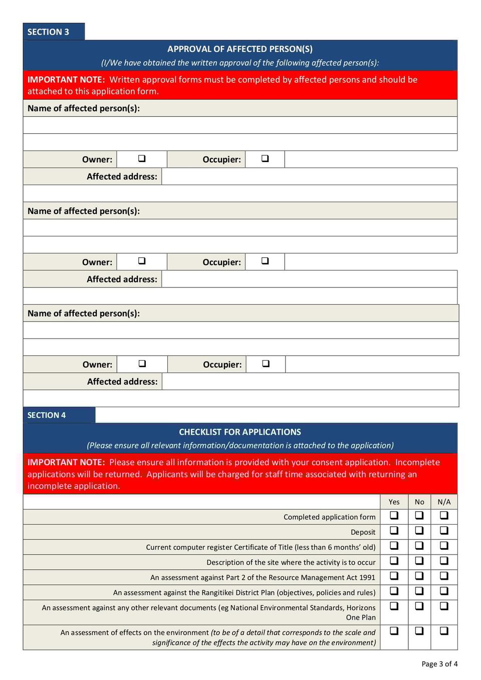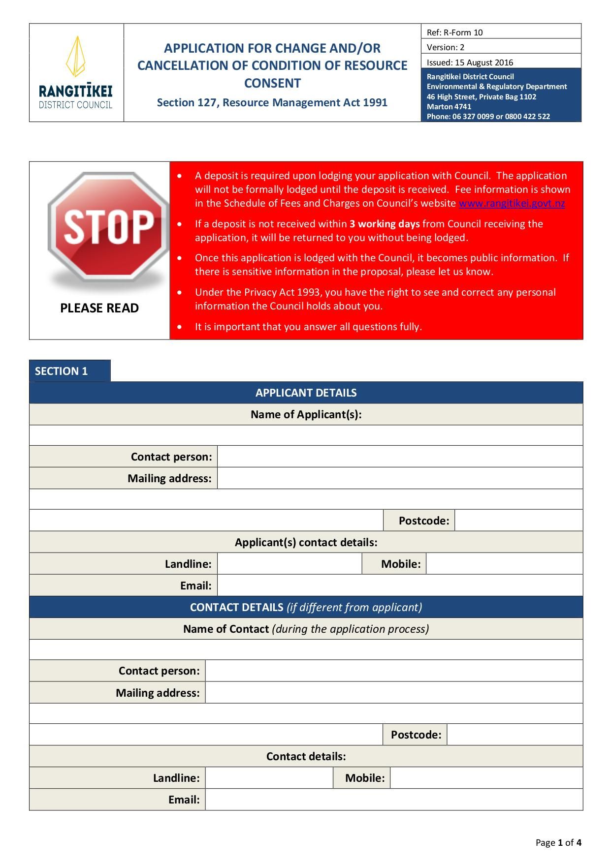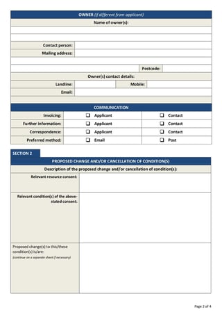 Application for Change and or Cancellation of Conditions of Resource Consent is used for requesting change or cancellation of conditions of resource consent.