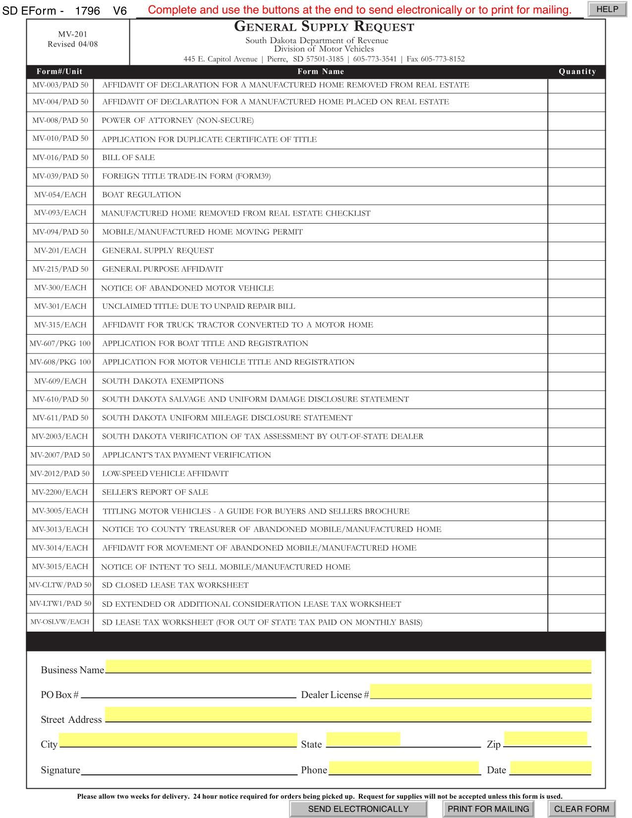 The Form MV-201 is used to request various supplies such as forms and pads for motor vehicle transactions.