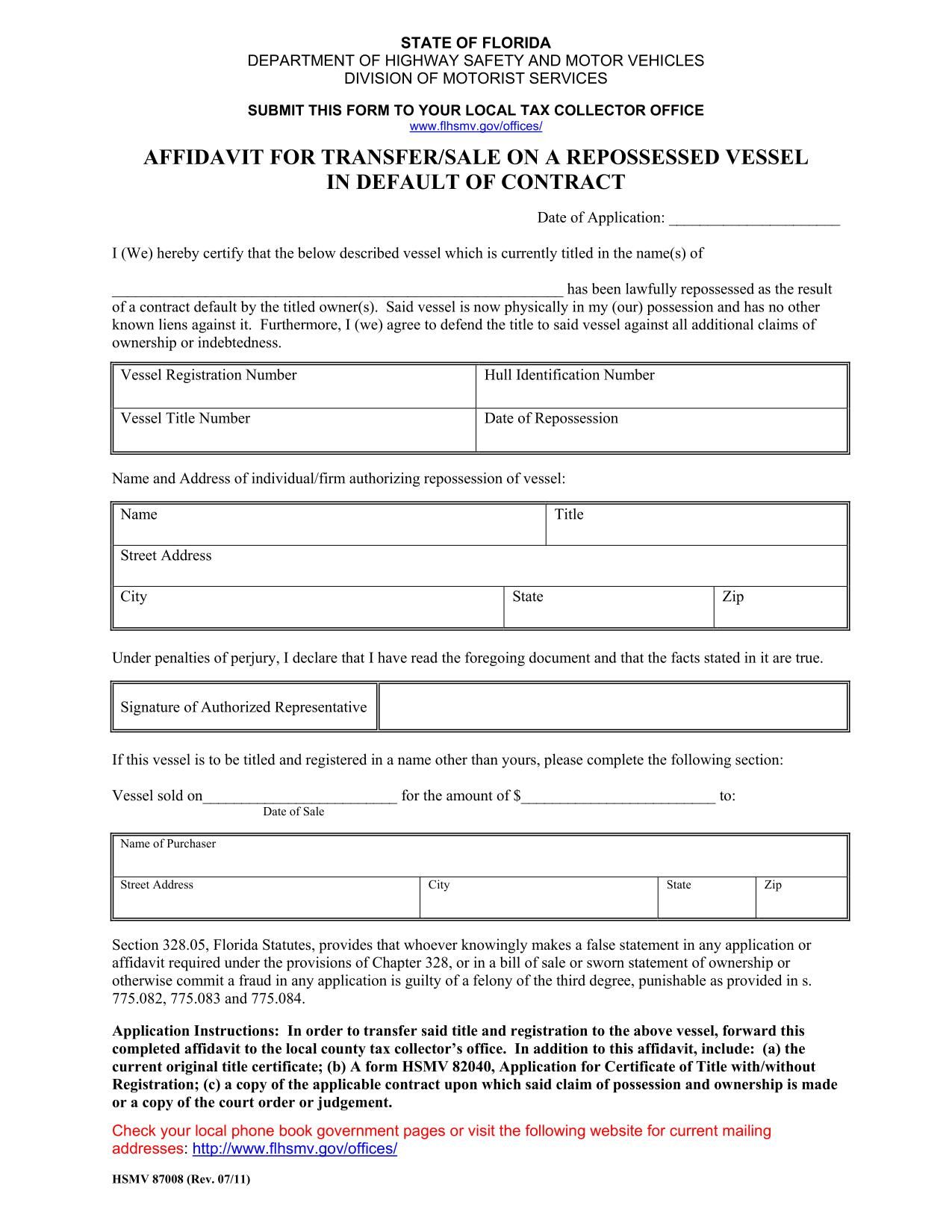 The Form HSMV 87008 is used to certify the repossession of a vessel due to a contract default.
