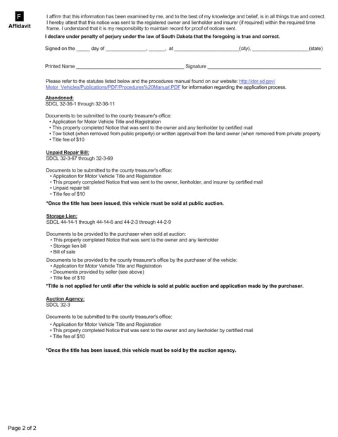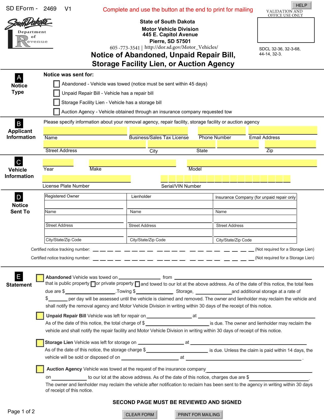 The Form 2469 is used for notifying about abandoned vehicles, unpaid repair bills, storage facility liens or auction agency details.