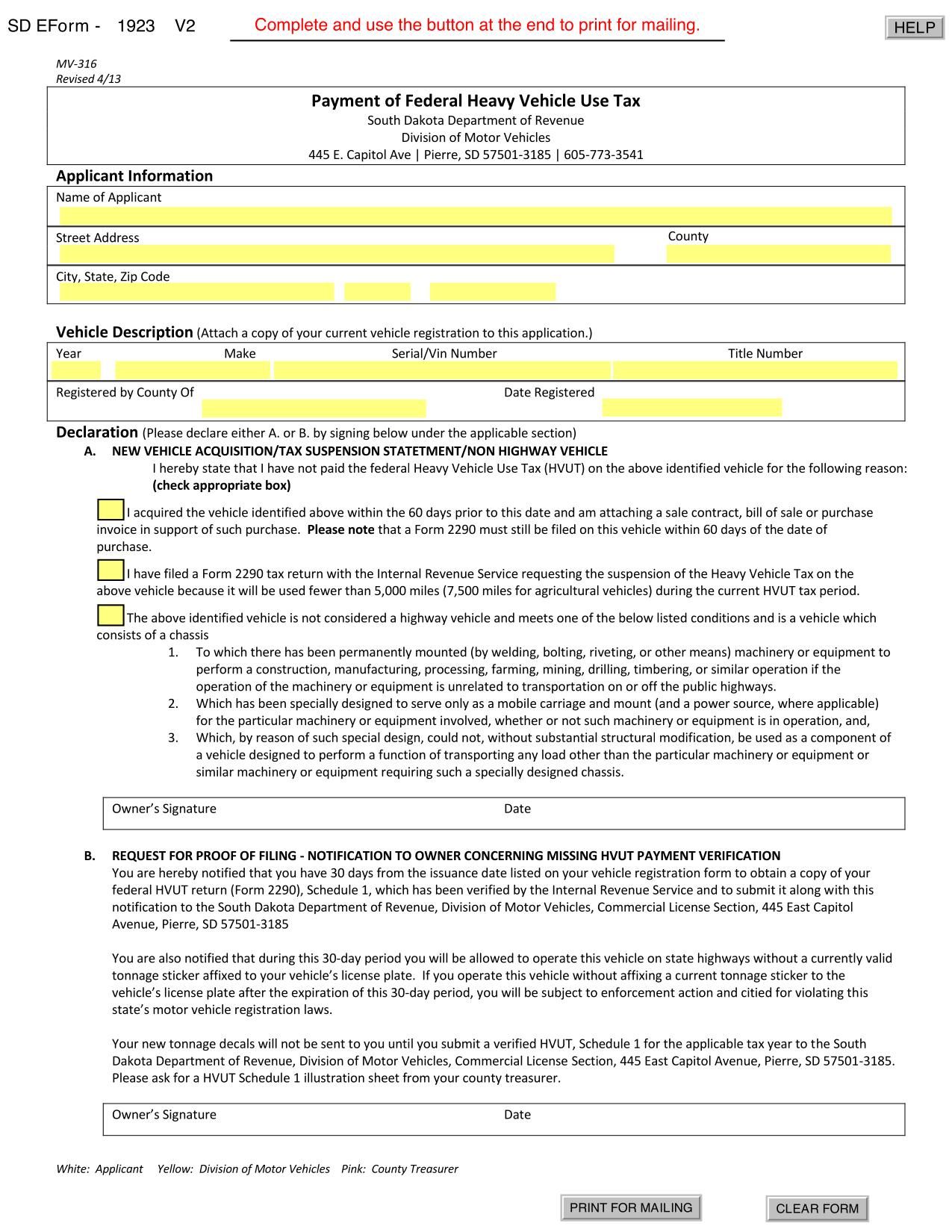 The Form MV-316 is used for the payment of the Federal Heavy Vehicle Use Tax in South Dakota.