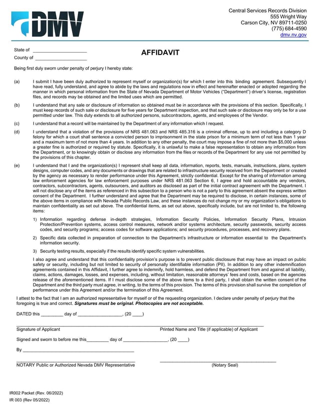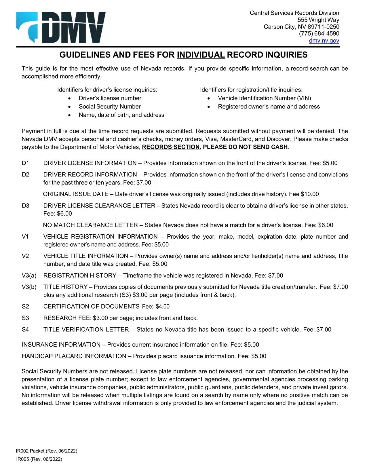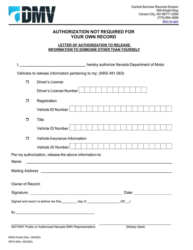 The Form IR002 is used to request individual records related to driver’s license and vehicle registration/title records in Nevada. The form includes instructions and requirements for requestors.