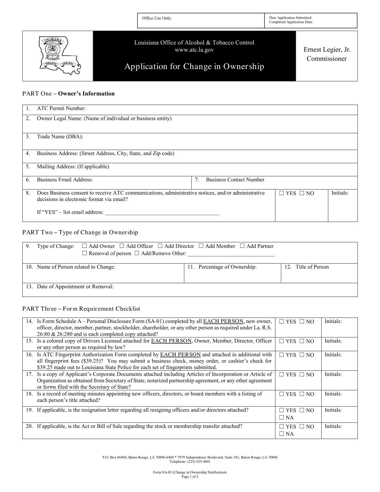 The Form SA-03 is used for notifying the Alcohol & Tobacco Control office of changes in ownership details of members, owners and officers.