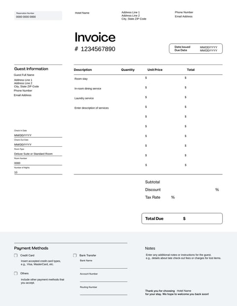 Our Hotel Invoice Template simplifies hotel billing by presenting a clear and accurate invoice to guests. It includes fields for guest information, stay details, service breakdown and payment methods.