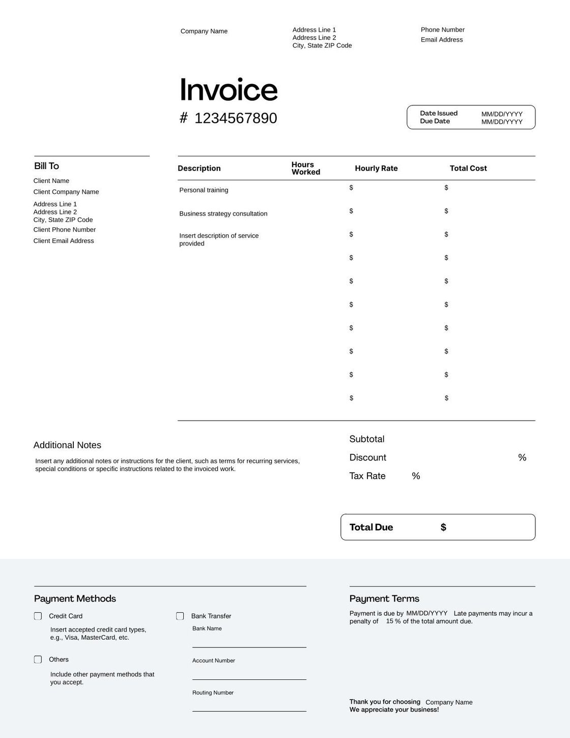 Our Hourly Invoice simplifies the billing process for professionals who charge by the hour. It includes fields for client information, service details, hours worked, hourly rates and total costs, making it easy to track and bill for time based services accurately.