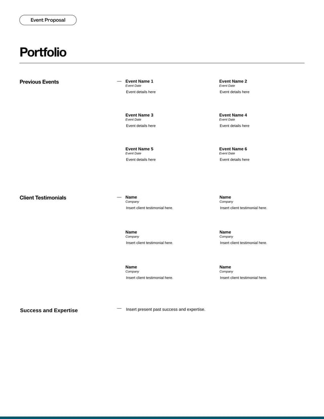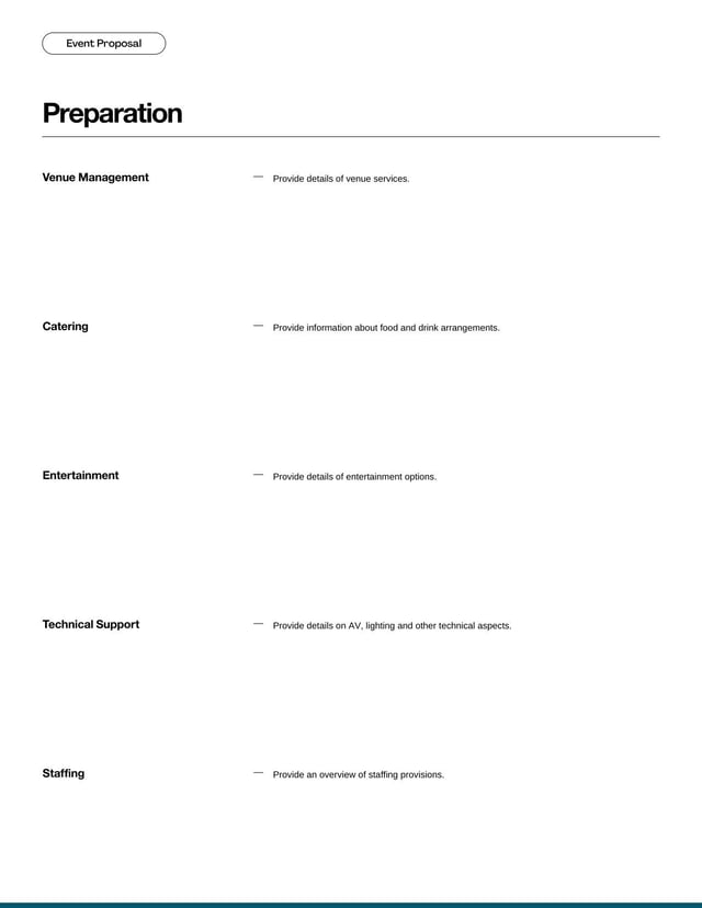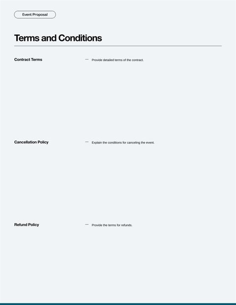 Our Event Proposal Template is a structured document used to outline the details, scope and costs of an event, offering a clear plan to potential clients. This template streamlines the planning process and ensures that all essential elements are communicated effectively for successful event management.