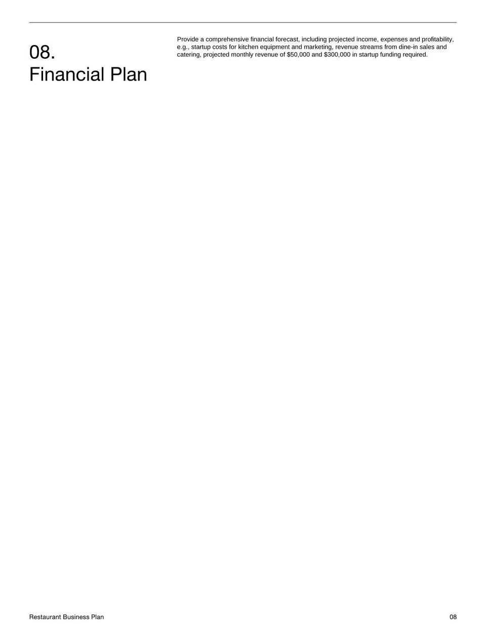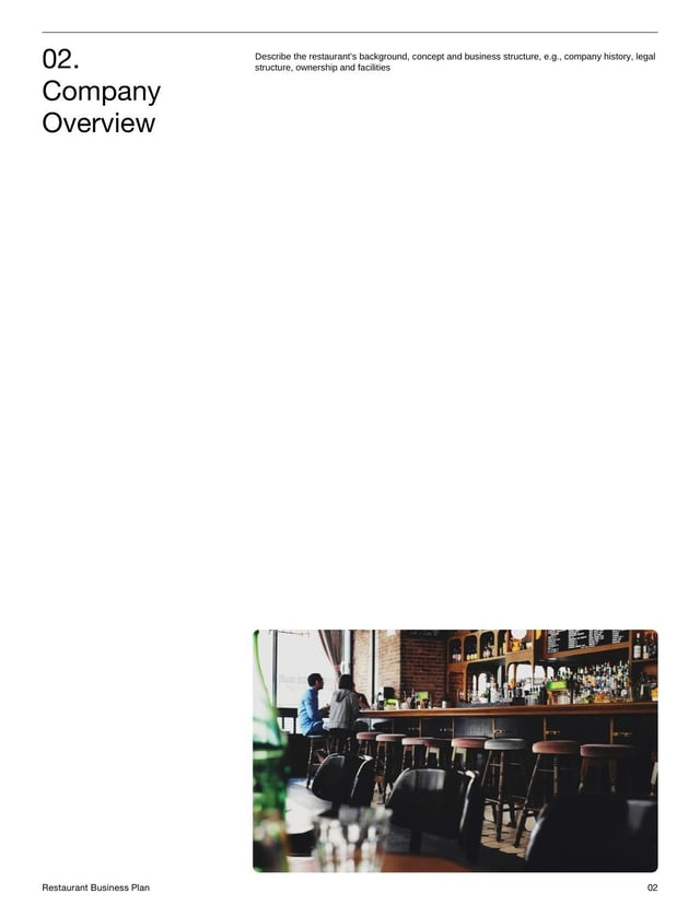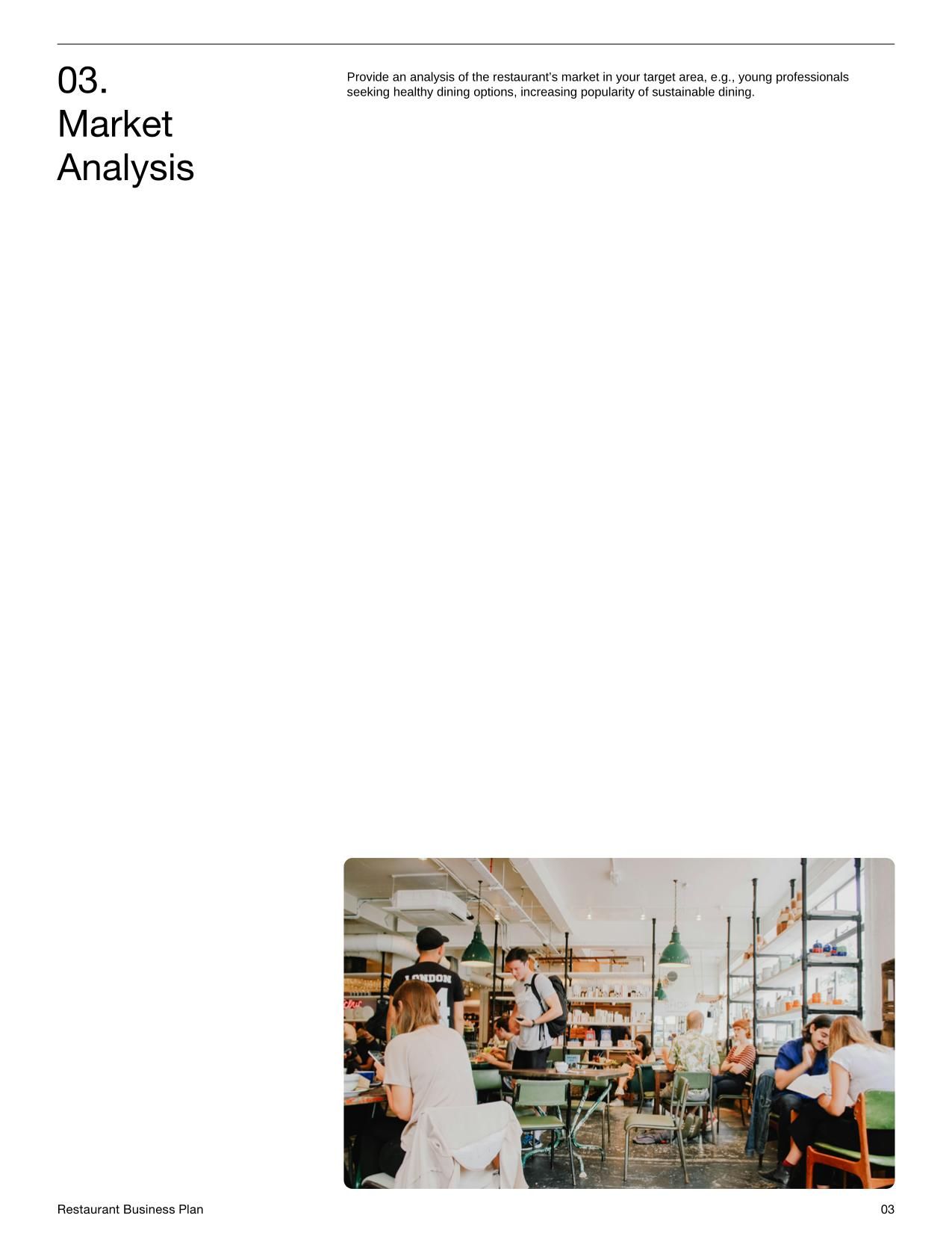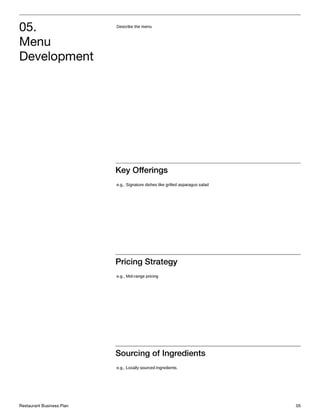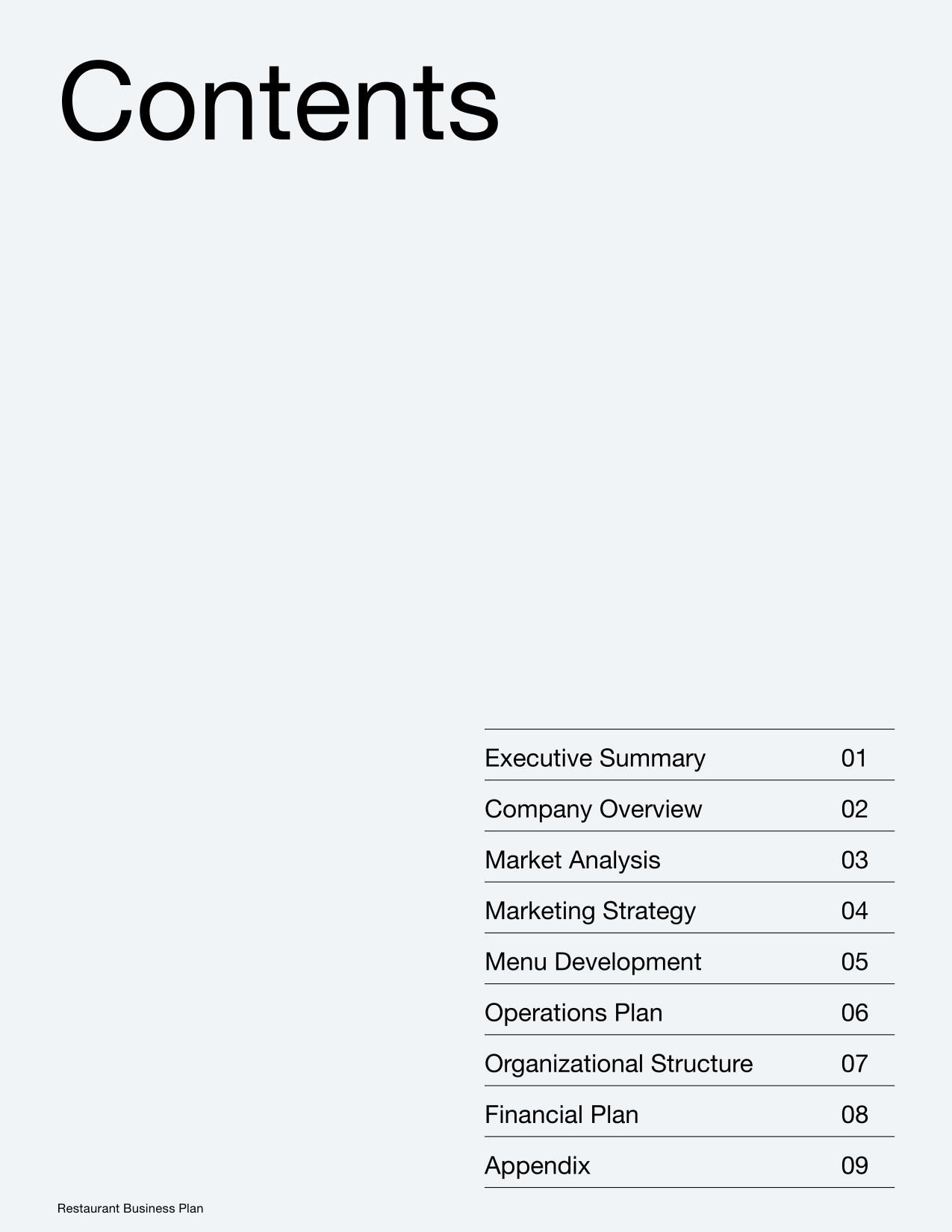Our Restaurant Business Plan helps restaurant owners and entrepreneurs outline their business strategy. It includes sections for the executive summary, company overview, market analysis, marketing strategy, menu development, operations plan, organizational structure, financial plan and appendix.