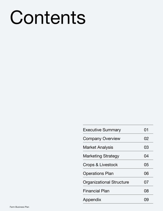 Our Farm Business Plan helps farm owners outline their business strategies, financial goals and operational plans. It covers essential areas such as market analysis, marketing strategies and daily operations, ensuring farmers have a roadmap to manage and grow their agricultural ventures successfully.