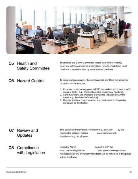 Our Health and Safety Policy Template for New Zealand outlines key responsibilities, procedures and measures to ensure a safe and healthy workplace. It includes sections for accident reporting, emergency plans, training and compliance with health and safety regulations. It is essential for organizations looking to formalize their health and safety commitments.