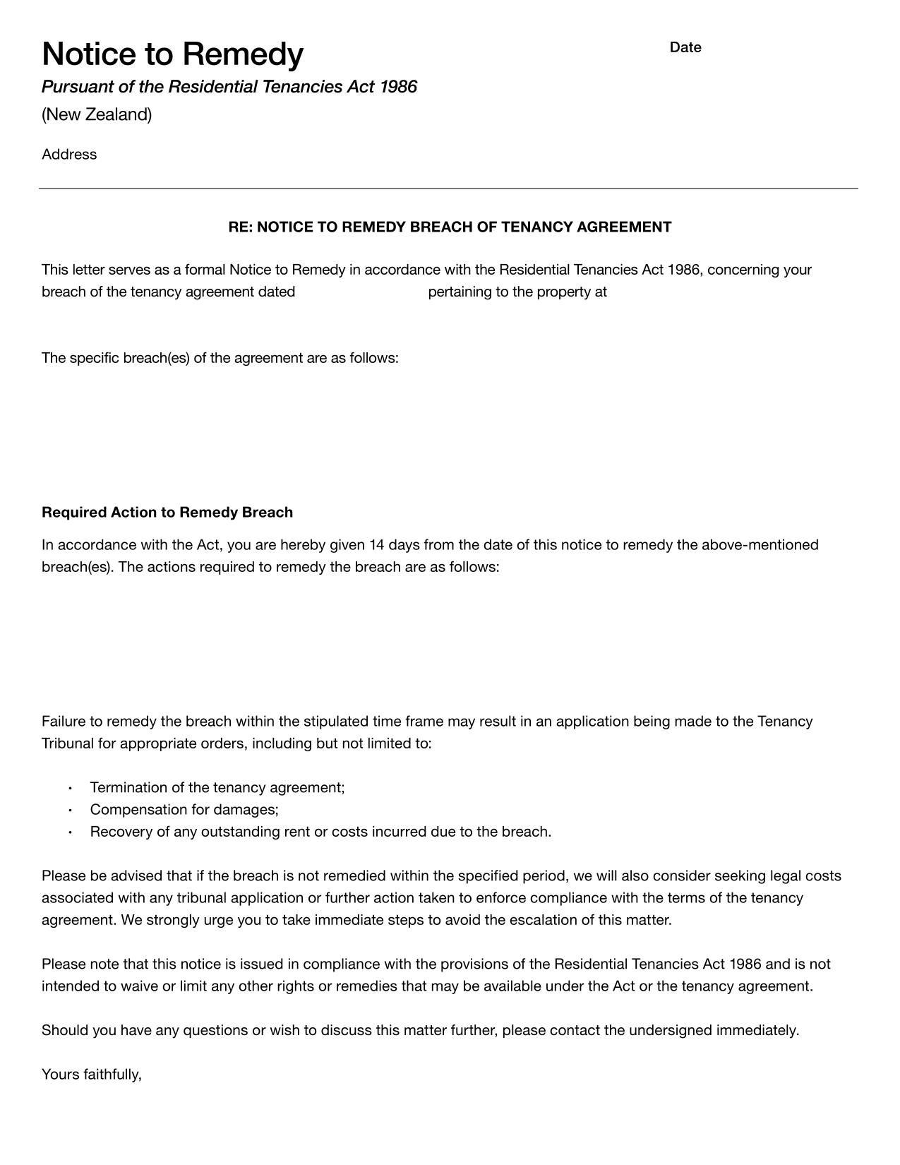 Notice to Remedy Template for New Zealand