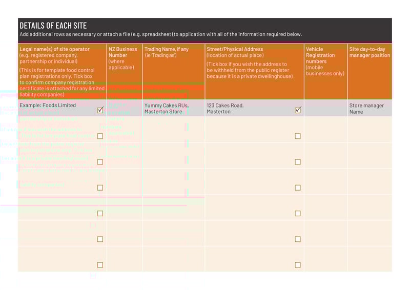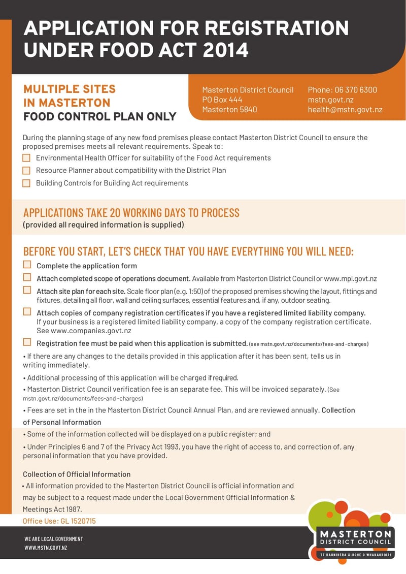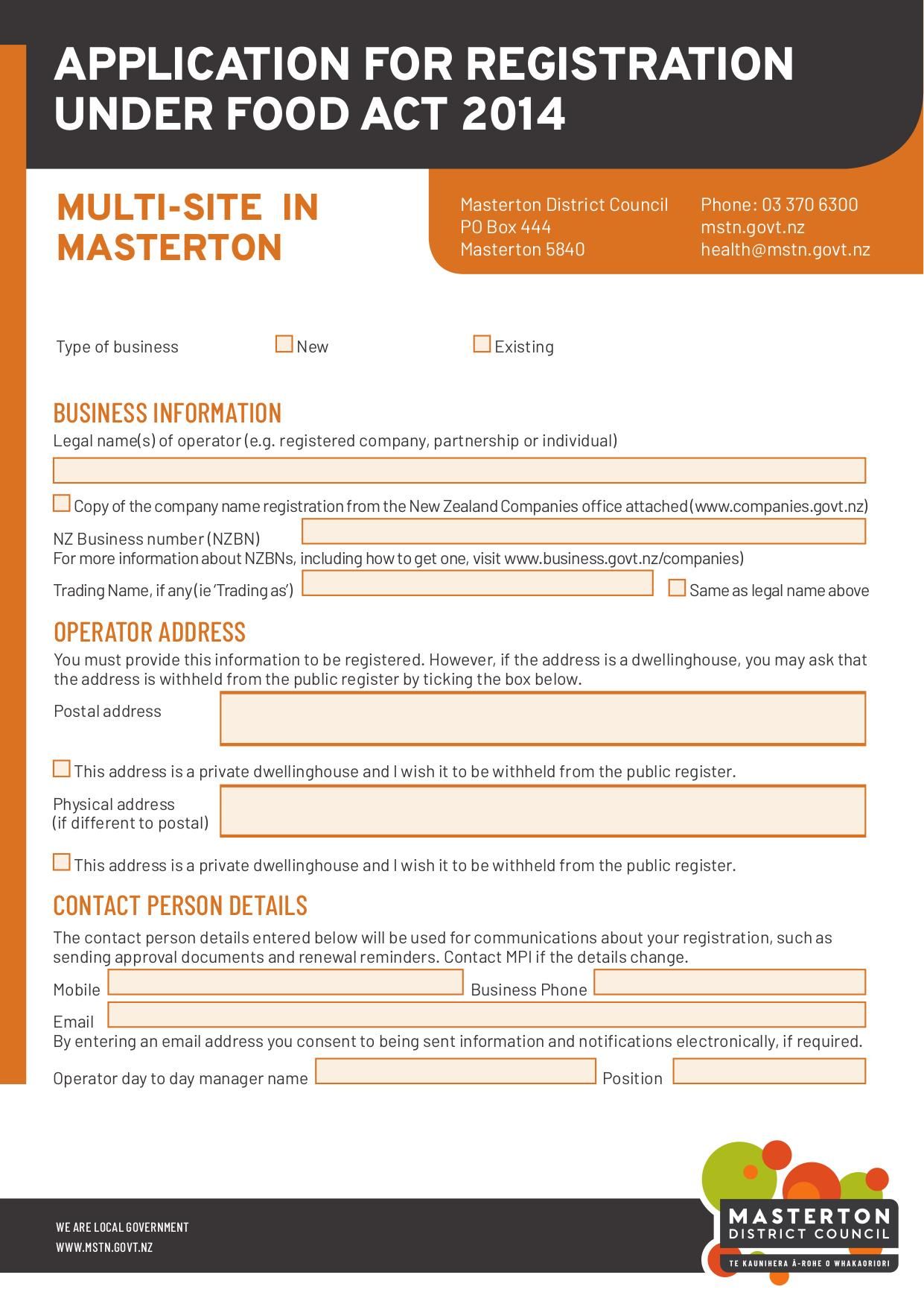 The Application for Registration Under Food Act 2014 is used by food establishments with multiple sites to apply for necessary permits and licenses.