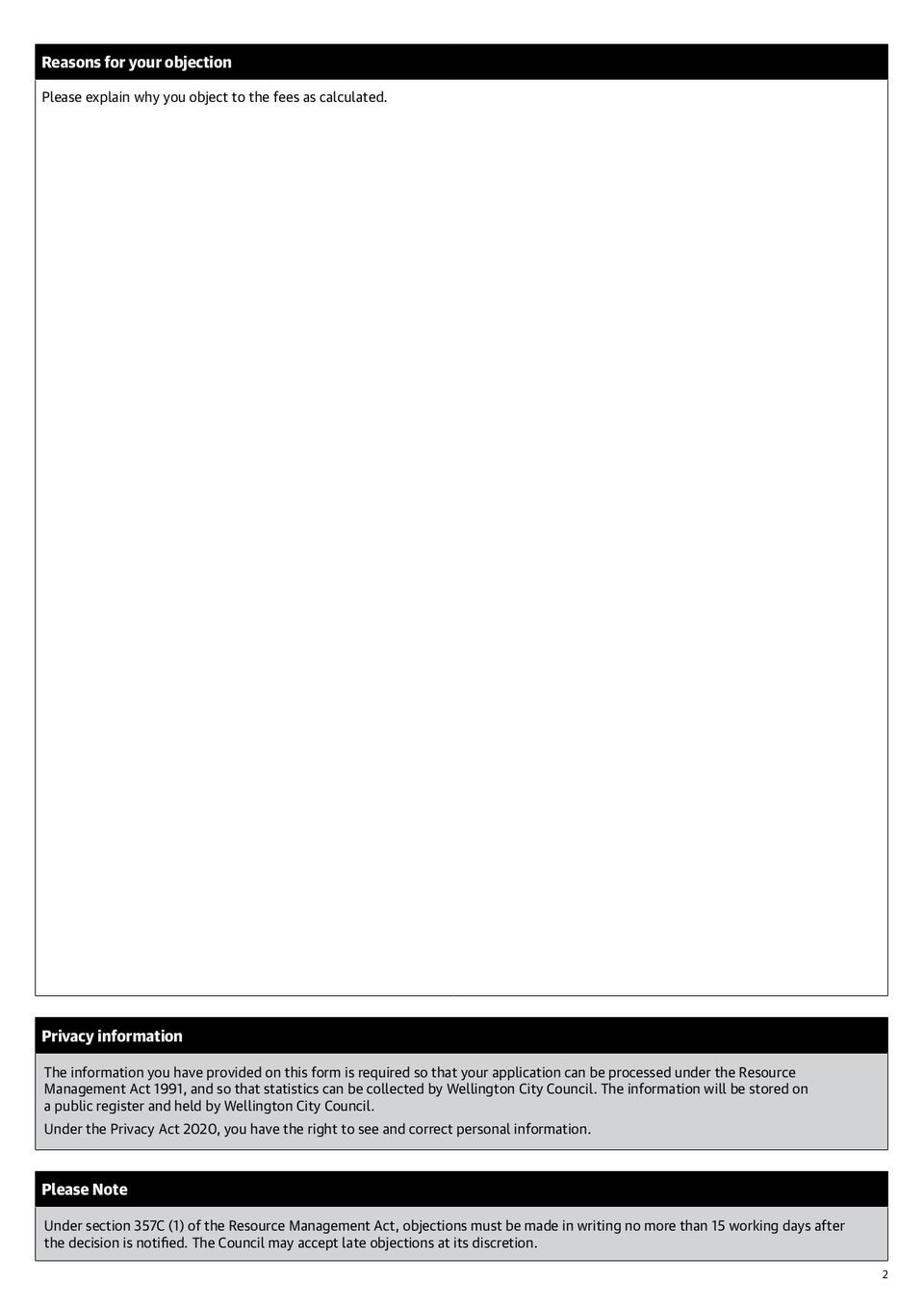 Form for object additional fees in Wellington City.