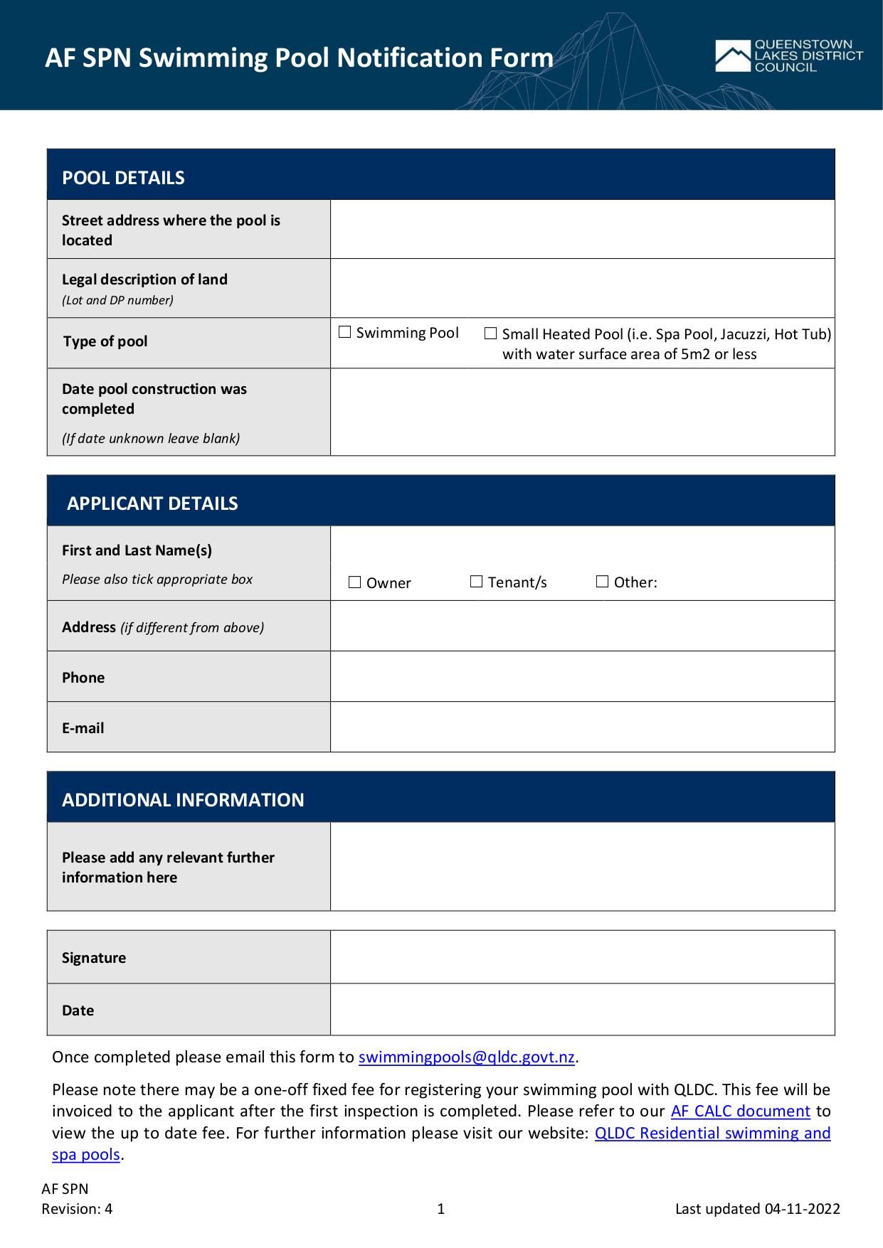 The AF SPN Swimming Pool Notification Form is required to be filled by swimming pool owners in Queenstown Lakes District. It is used to notify the Queenstown Lakes District Council about the existence of a swimming pool.