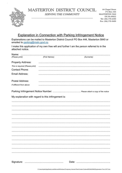 The Fillable Explanation Form is a form issued by the Masterton District Council. It is a fillable form that allows the general public to provide explanations or additional information.