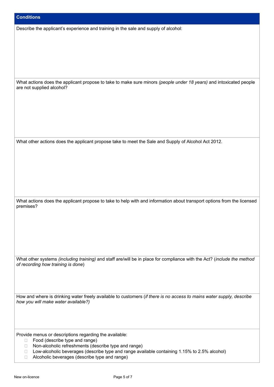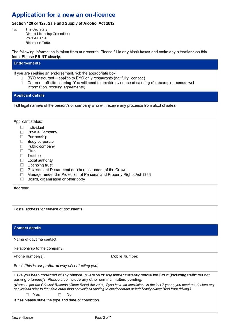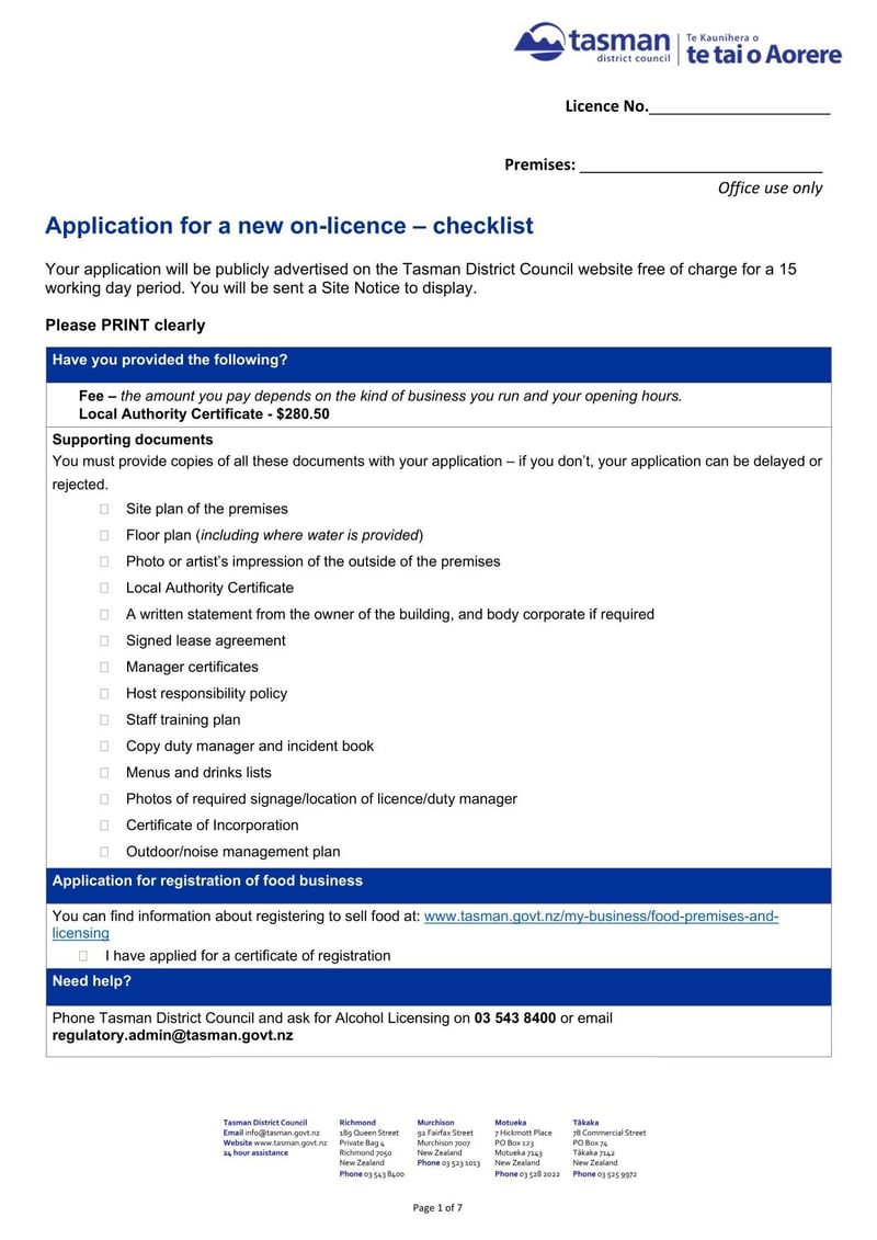 The New Zealand Application for a New On-Licence is used by businesses applying for a licence to sell alcohol for on-premises consumption under the Sale and Supply of Alcohol Act 2012.