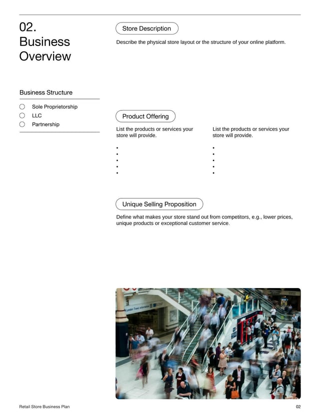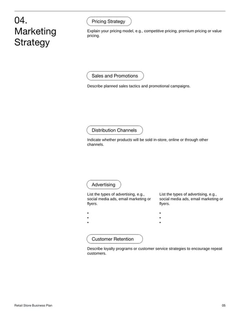 Our Retail Store Business Plan Template guides entrepreneurs through the process of creating a retail business strategy. It includes sections for defining business goals, analyzing the market, outlining product offerings and projecting financials. It helps businesses align their business model with industry trends, streamline operations and secure funding.