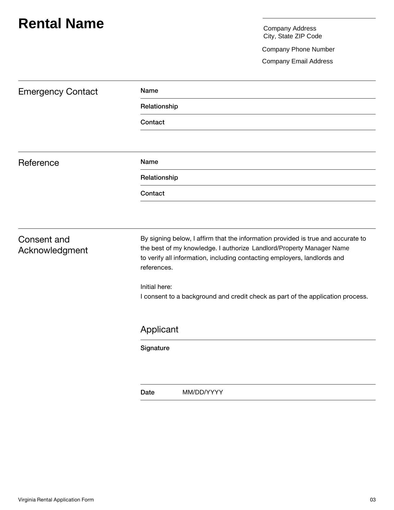 The Rental Application Form Virginia is used for collecting tenant details for the leasing process. It captures personal information, rental history and employment details, along with income verification and references. The form includes additional sections for pets, smoking preferences and vehicle information to ensure alignment with property rules.