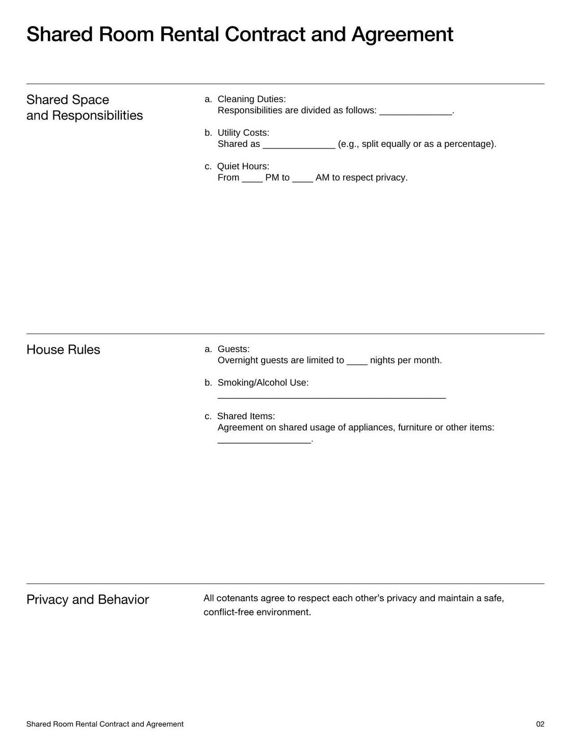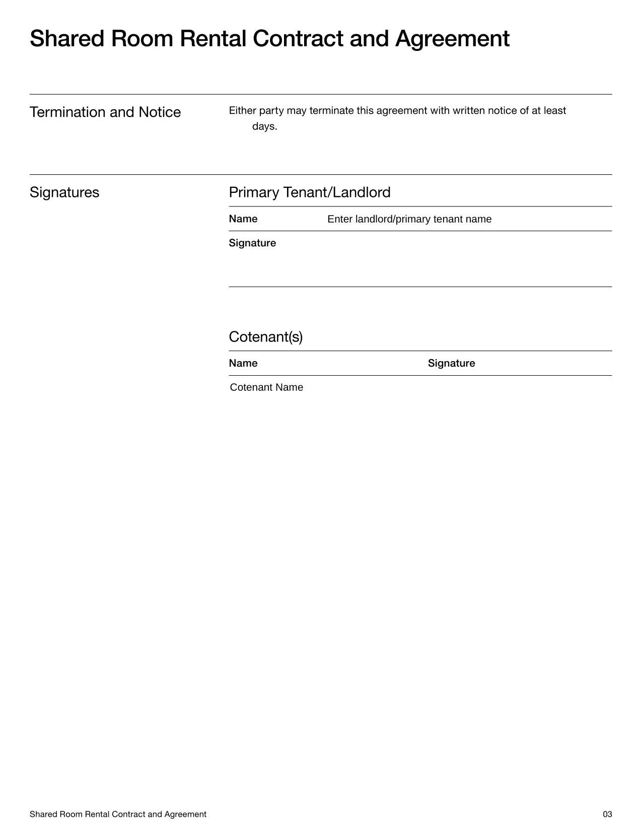 - Shared Room Rental Contract and Agreement Template