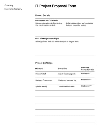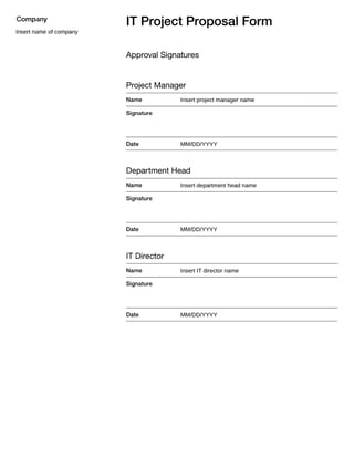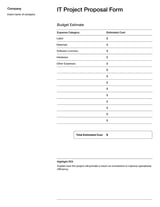 The IT Project Proposal Form serves as a document outlining the key elements of an IT project. It includes sections for defining the project’s purpose, objectives, scope and anticipated risks, along with a detailed schedule, resource allocation, and budget estimate. The form is designed to ensure that all stakeholders are aligned on project goals, deliverables and required resources. It also emphasizes ROI, helping to assess the project's potential impact on operational efficiency. The form concludes with sections for the necessary approval signatures from the project manager, department head and IT director, ensuring formal endorsement before the project execution.