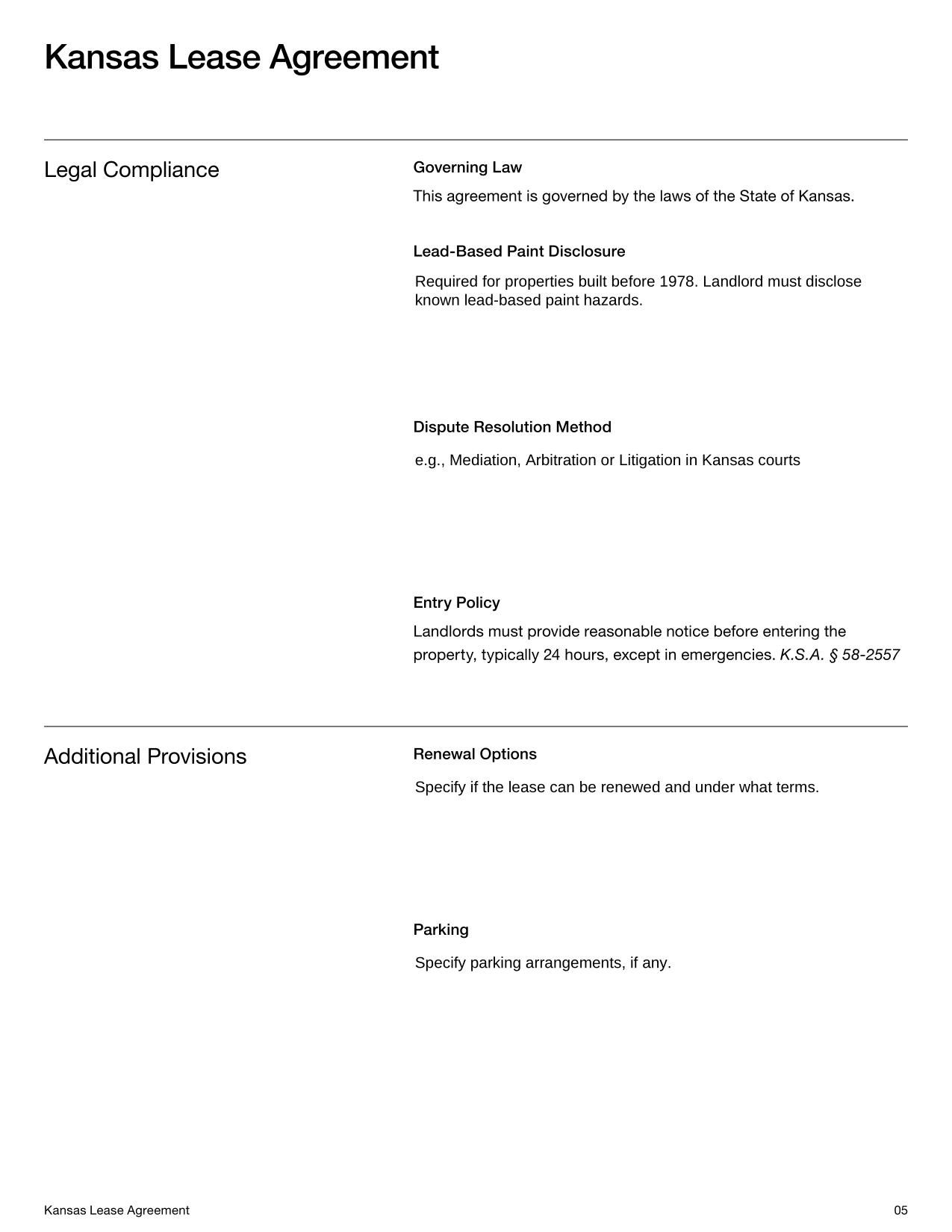 A Kansas Lease Agreement is a legally binding document between a landlord and tenant that defines the terms for a rental property. It includes the landlord and tenant's contact details, property address, lease duration, rent payment terms, and security deposit requirements. The agreement also specifies responsibilities for maintenance, utilities, pets, smoking, and insurance. It details the notice period for termination, legal compliance, and dispute resolution, ensuring both parties understand their obligations for a clear and fair rental experience.