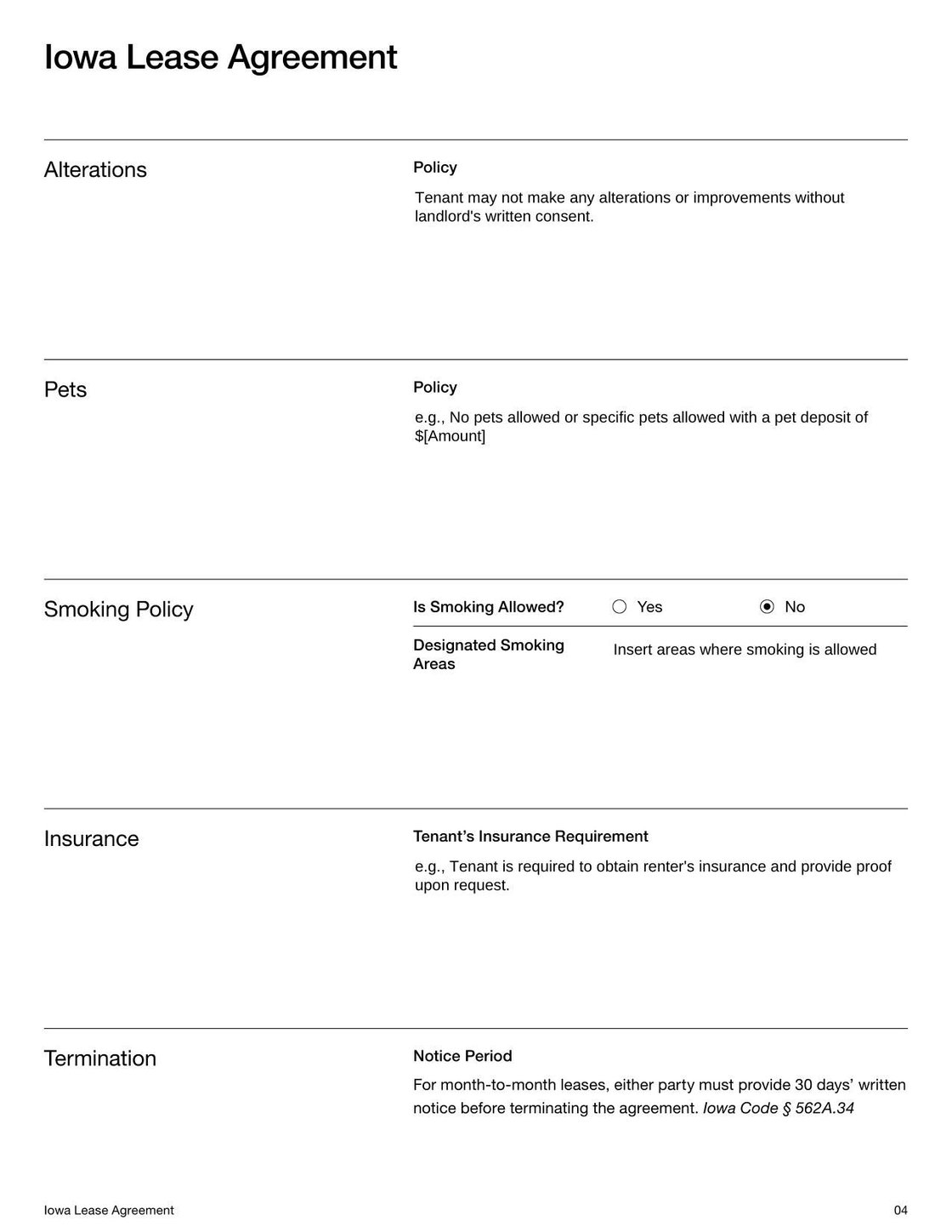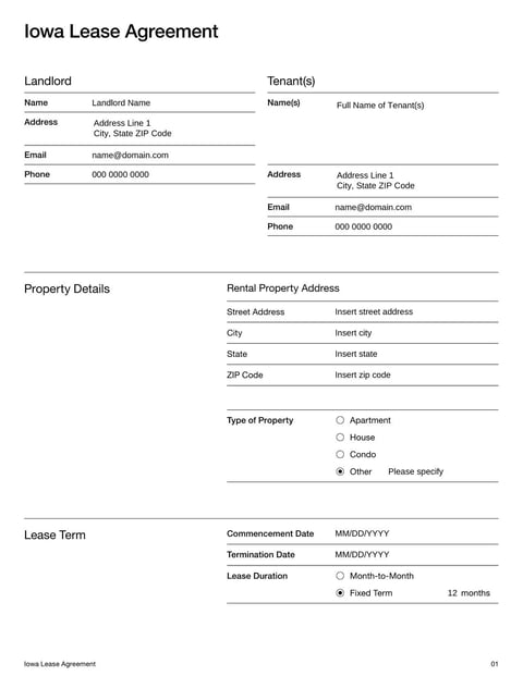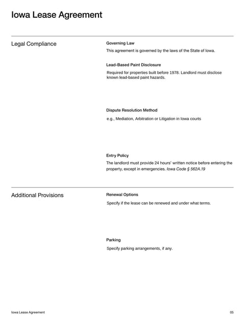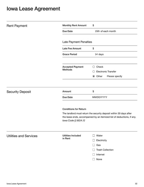 An Iowa Lease Agreement is a legal contract that sets the terms and conditions for renting property in Iowa. It provides clarity on the roles and responsibilities of both the landlord and tenant, helping to create a fair and structured rental arrangement while ensuring compliance with state laws.