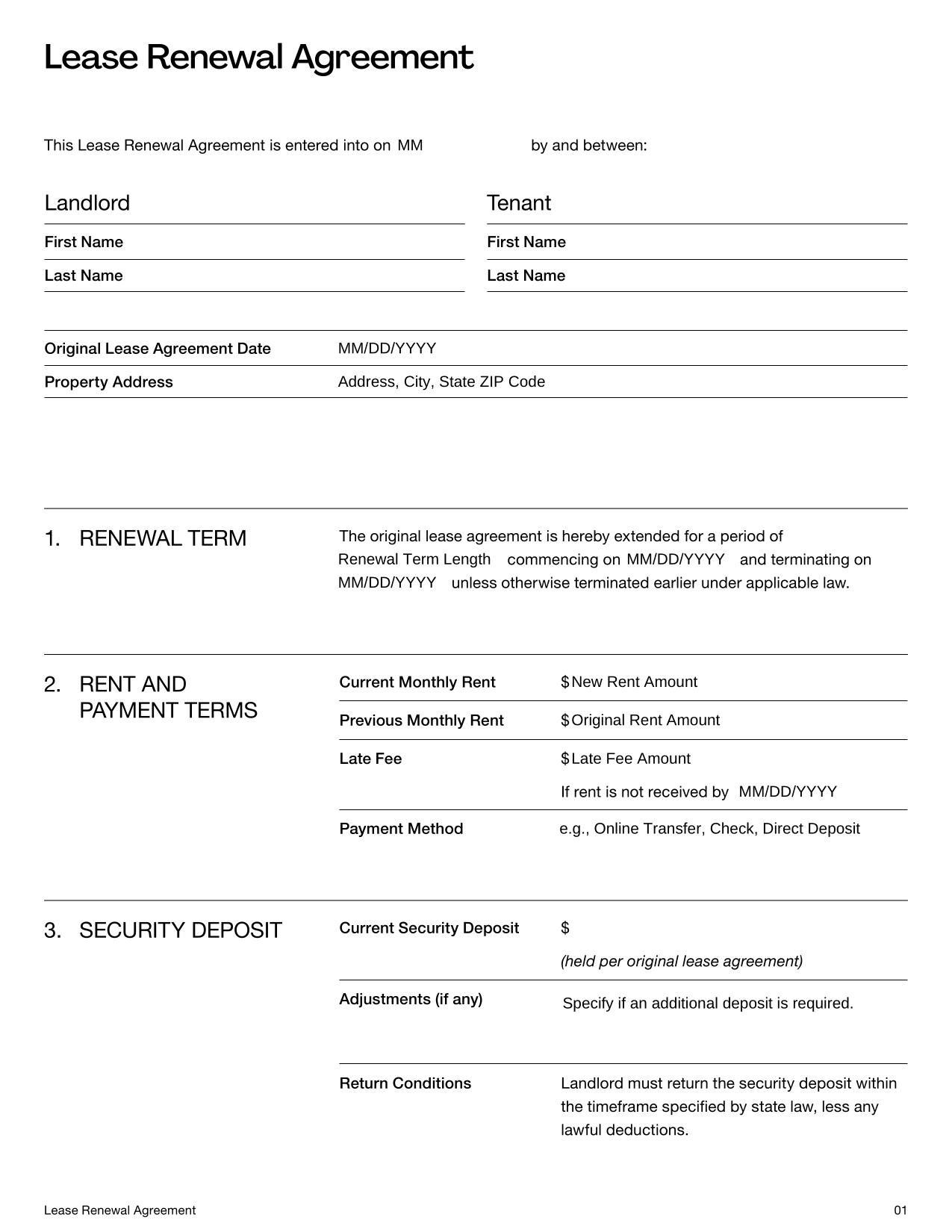 A Lease Renewal Agreement is a legal document that allows a landlord and tenant to extend the terms of an existing lease for an additional period. This agreement provides an opportunity to modify certain terms, such as rent amount or lease duration, while maintaining the continuity of the rental arrangement. It ensures that both parties clearly understand and agree to the updated terms, promoting a continued positive landlord-tenant relationship.