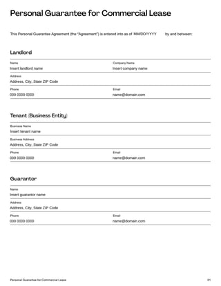 A Personal Guarantee for Commercial Lease is a legal commitment where an individual, a business owner or principal, agrees to be personally responsible for fulfilling the lease obligations if the business entity fails to do so. This means that if the business defaults on rent or other lease terms, the landlord can seek payment directly from the individual who provided the guarantee. Landlords often require personal guarantees to mitigate the risk associated with leasing to new or financially unstable businesses.