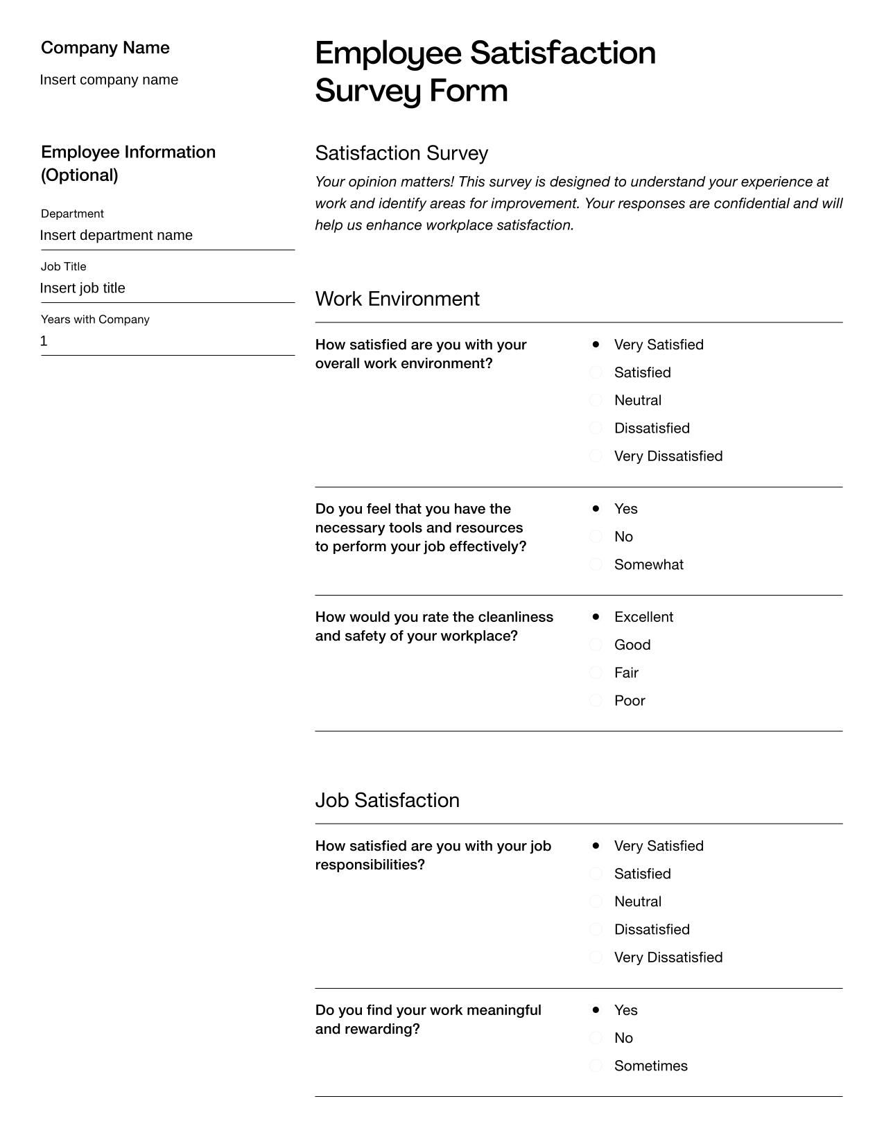 Employee Satisfaction Survey Form Template