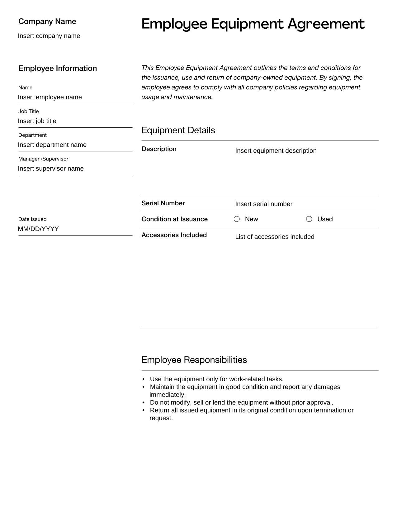 An Employee Equipment Agreement defines the terms under which an employee is assigned company-owned equipment, specifying responsibilities for use, maintenance and return.
