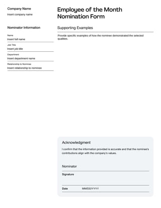 An Employee of the Month Nomination Form allows employees or managers to nominate a colleague for outstanding performance. It collects details about the nominee’s contributions and why they deserve recognition.