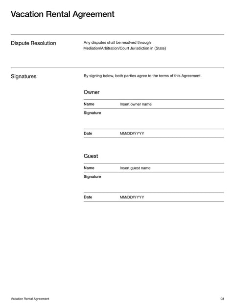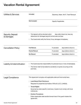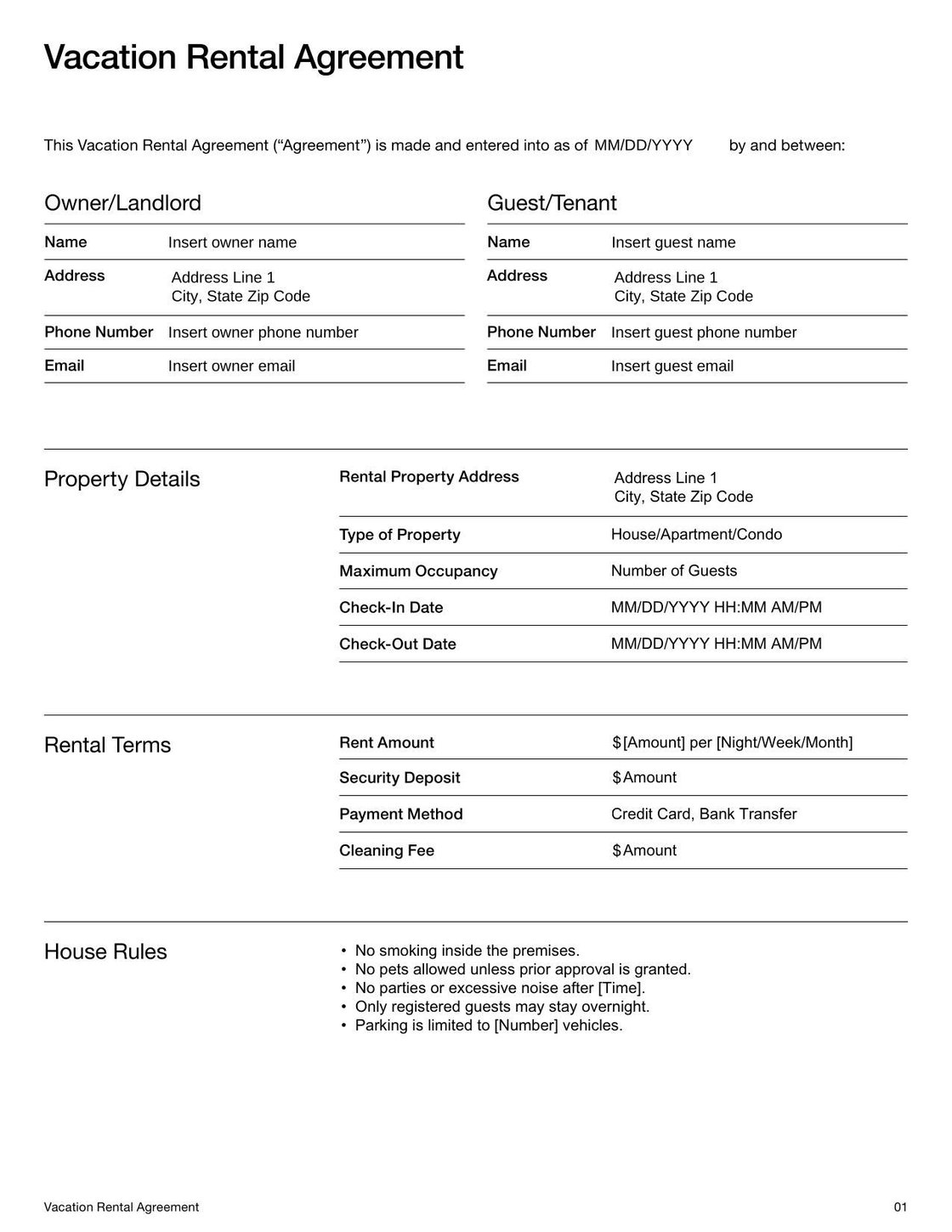 A Vacation Rental Agreement Form is a legally binding document that defines the terms of a short-term rental. It includes rental dates, payment terms, security deposit details and house rules to ensure a smooth rental experience.
