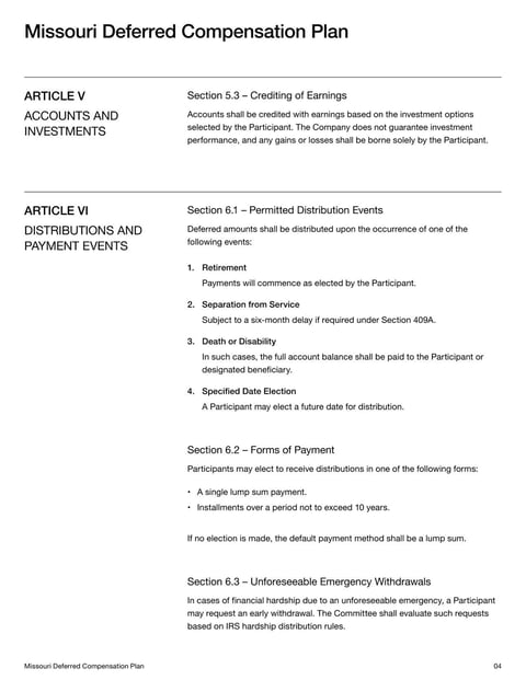 A Missouri Deferred Compensation Plan allows state employees to update contributions, request withdrawals or make changes such as naming a new beneficiary. It's used for account-related actions, including rollover requests, retirement withdrawals or emergency access to funds.