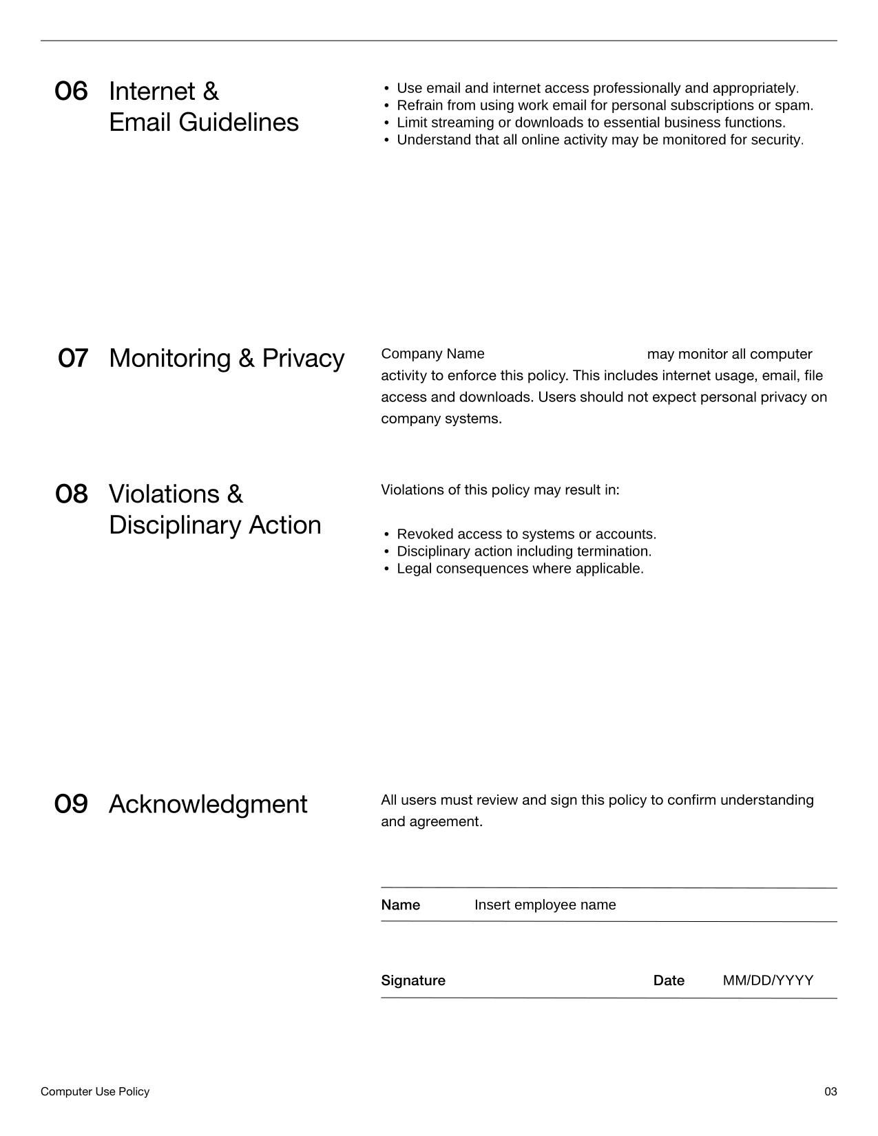 A Computer Use Policy explains how employees should use company computers and technology. It covers acceptable activities, security expectations and rules for protecting company data.