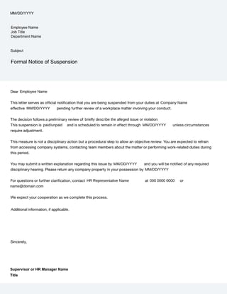 An Employee Suspension Letter formally notifies a staff member of their temporary removal from duties. It explains the reason, duration and expectations during the suspension period.