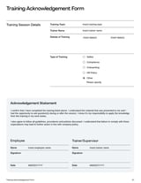 A Training Acknowledgement Form confirms that an employee has completed a specific training and understands the material covered. It serves as a formal record for compliance and internal documentation purposes.