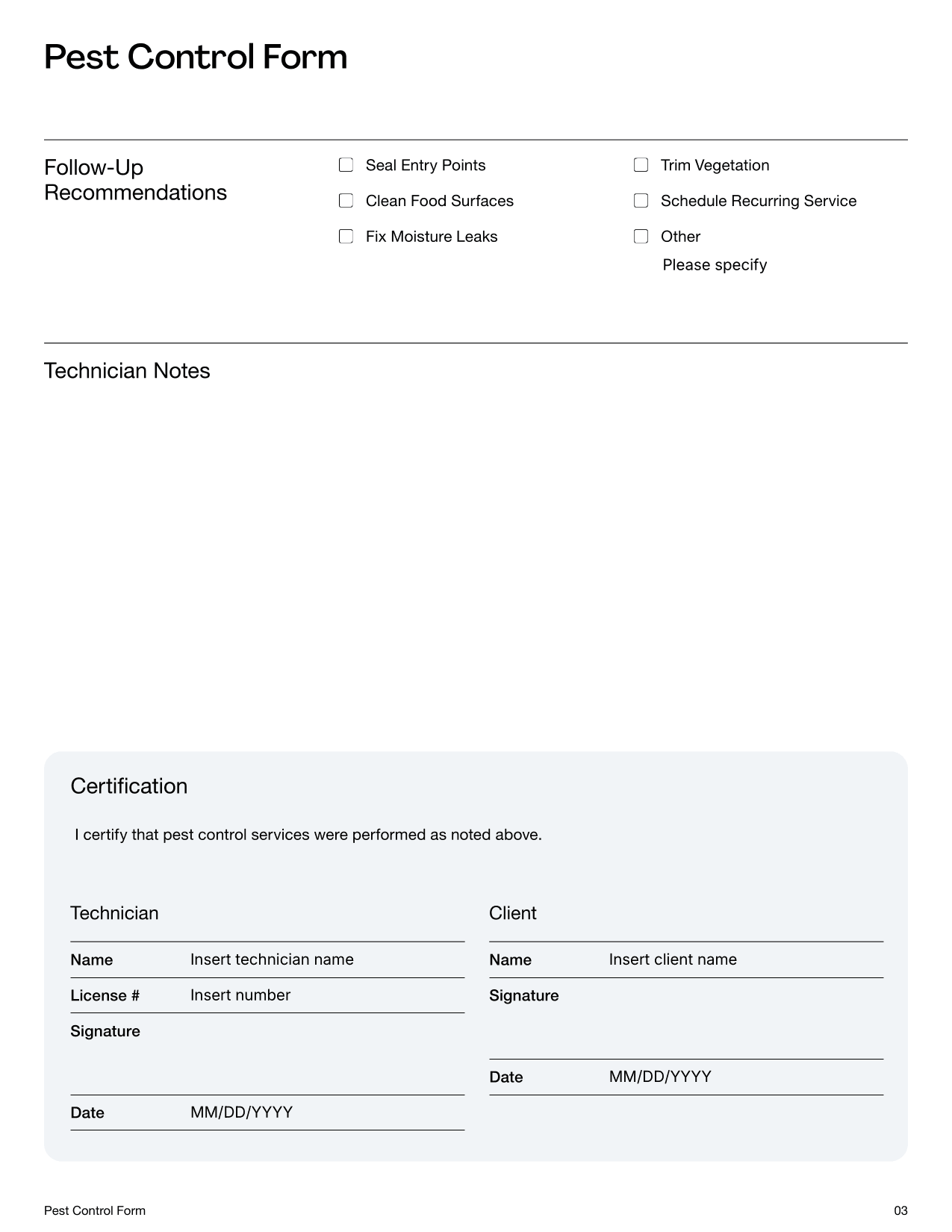 A Pest Control Form is a document that records pest activity, service details and treatment methods used during pest management services. It assists pest control companies and clients in tracking progress, ensuring safety and complying with legal and environmental standards.