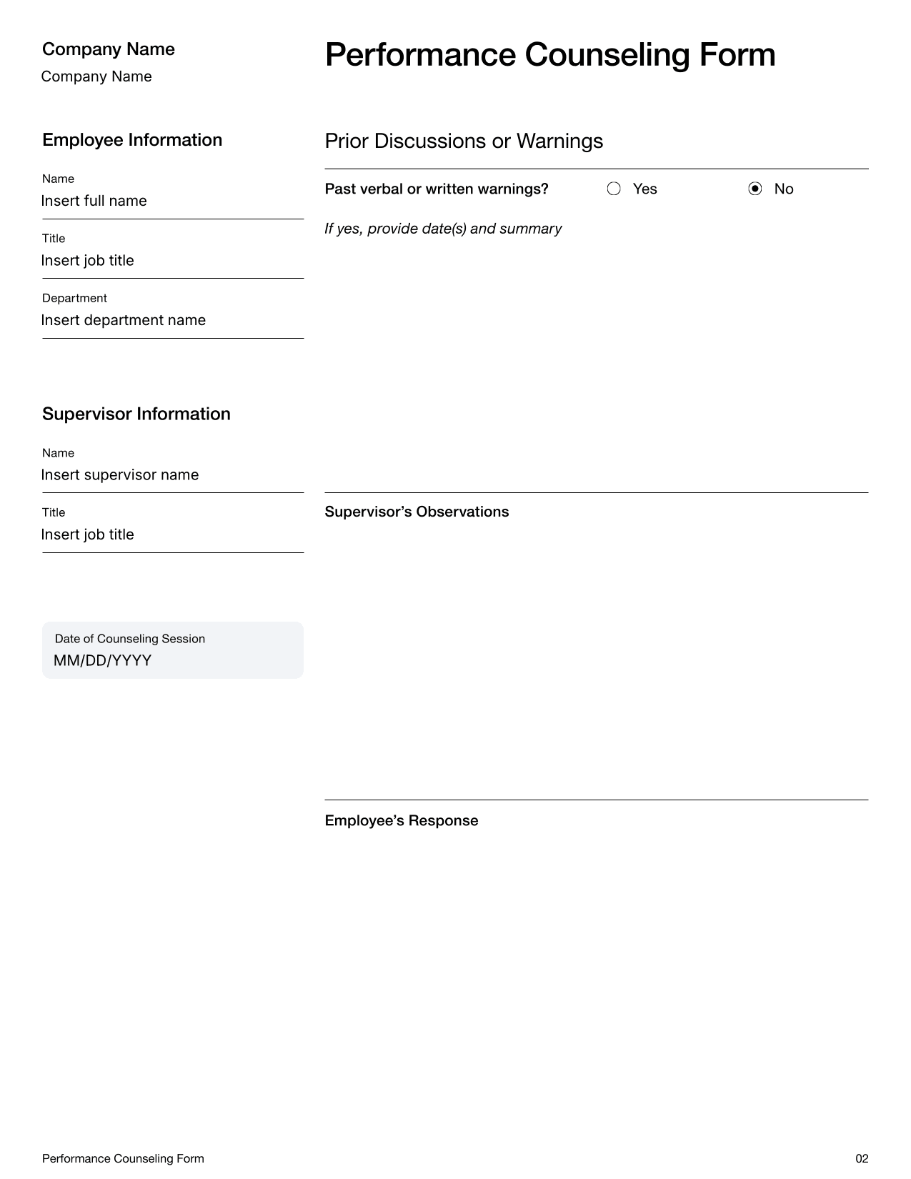 Performance Counseling Form Template