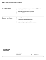 The HR Compliance Checklist is a tool that helps HR teams verify adherence to labor laws, internal policies and regulatory obligations. It covers all key areas including hiring, employee records, pay practices, safety, benefits and termination procedures to ensure company-wide compliance.