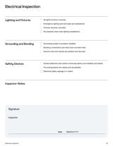 This Electrical Inspection Checklist helps inspectors, facility managers and electricians ensure compliance with safety codes and standards. It covers essential checks for wiring, panels, outlets, grounding, lighting and system safety.