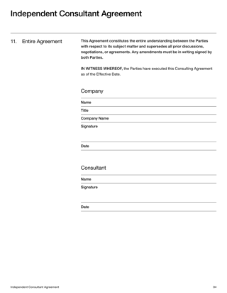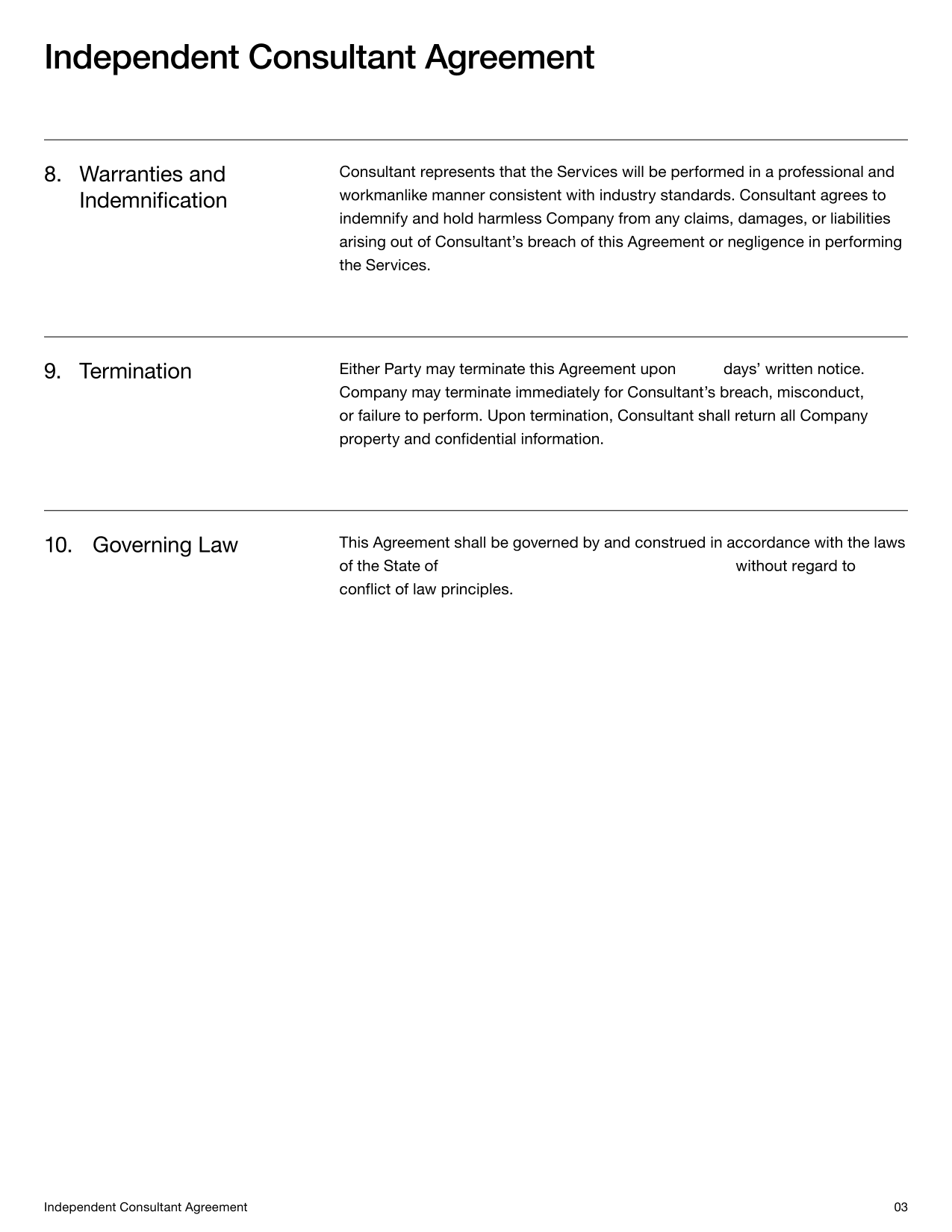 An Independent Consultant Agreement is a contract that sets out the scope of services, payment terms and responsibilities when hiring an independent consultant. It helps prevent disputes by detailing intellectual property ownership, confidentiality obligations and indemnification.