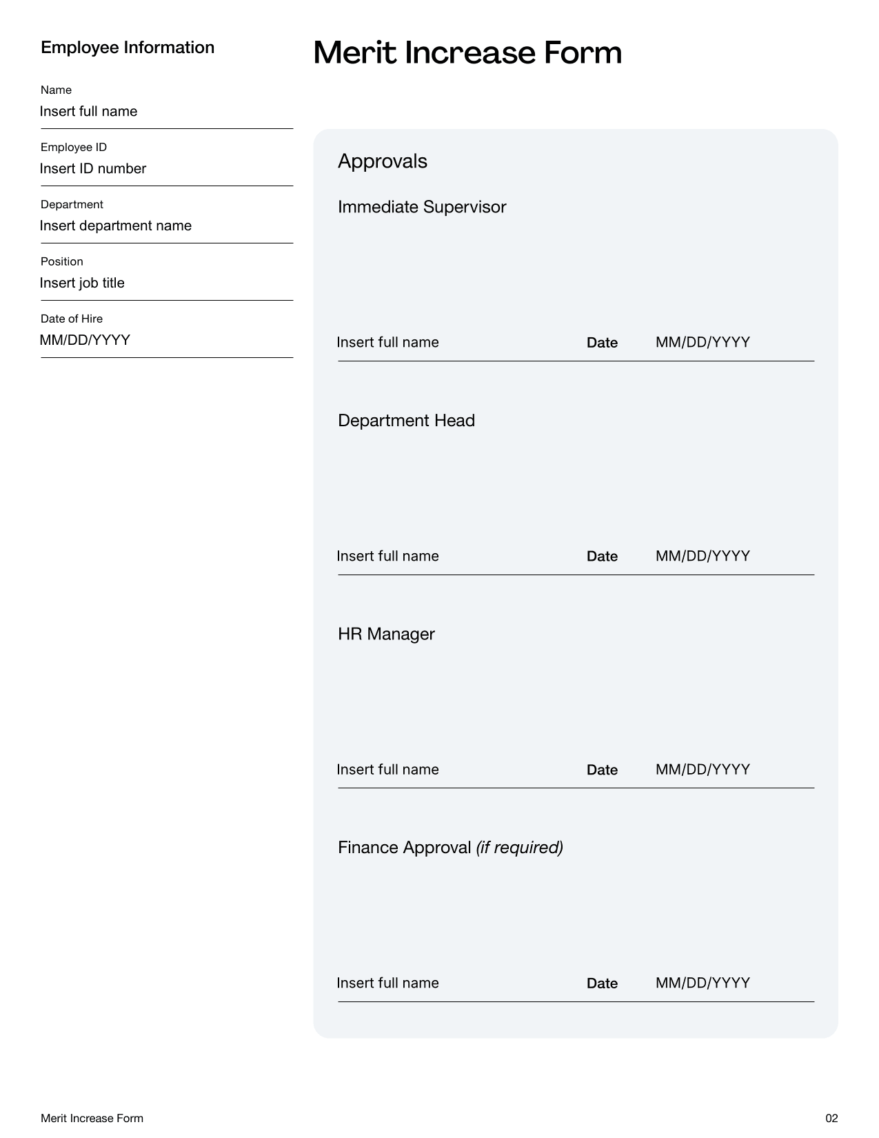 The Merit Increase Form is a document used by HR to record and approve salary increases resulting from employee performance evaluations, promotions or market adjustments.