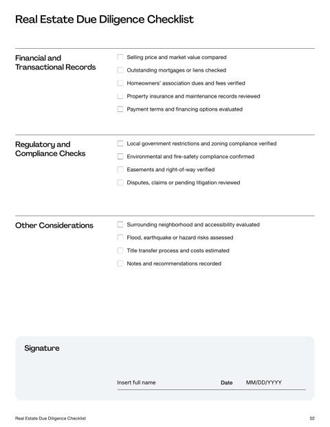 The Real Estate Due Diligence Checklist helps property buyers and investors assess a property’s legal, physical and financial status before finalizing a purchase. It ensures that all required documents, permits and inspections are completed to avoid costly mistakes or disputes.