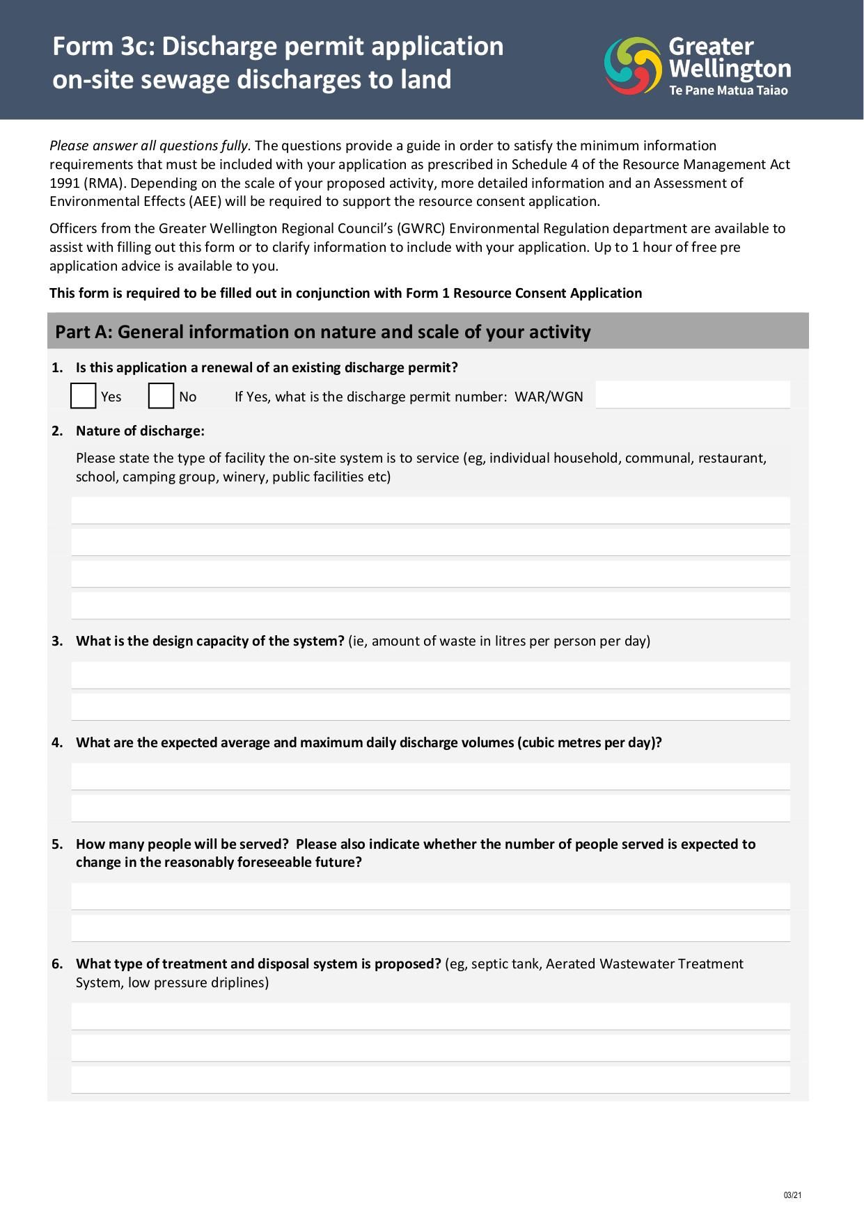 Form 3c is an application form for obtaining a discharge permit for on-site sewage discharges to land. This form is required to be filled by property owners and sewage system operators who intend to discharge sewage to land.